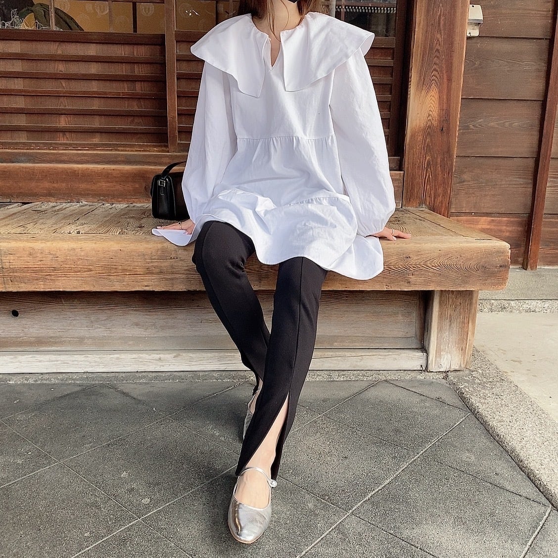 コーデのポイントになるシルバーカラーのメリージェーンシューズ。
