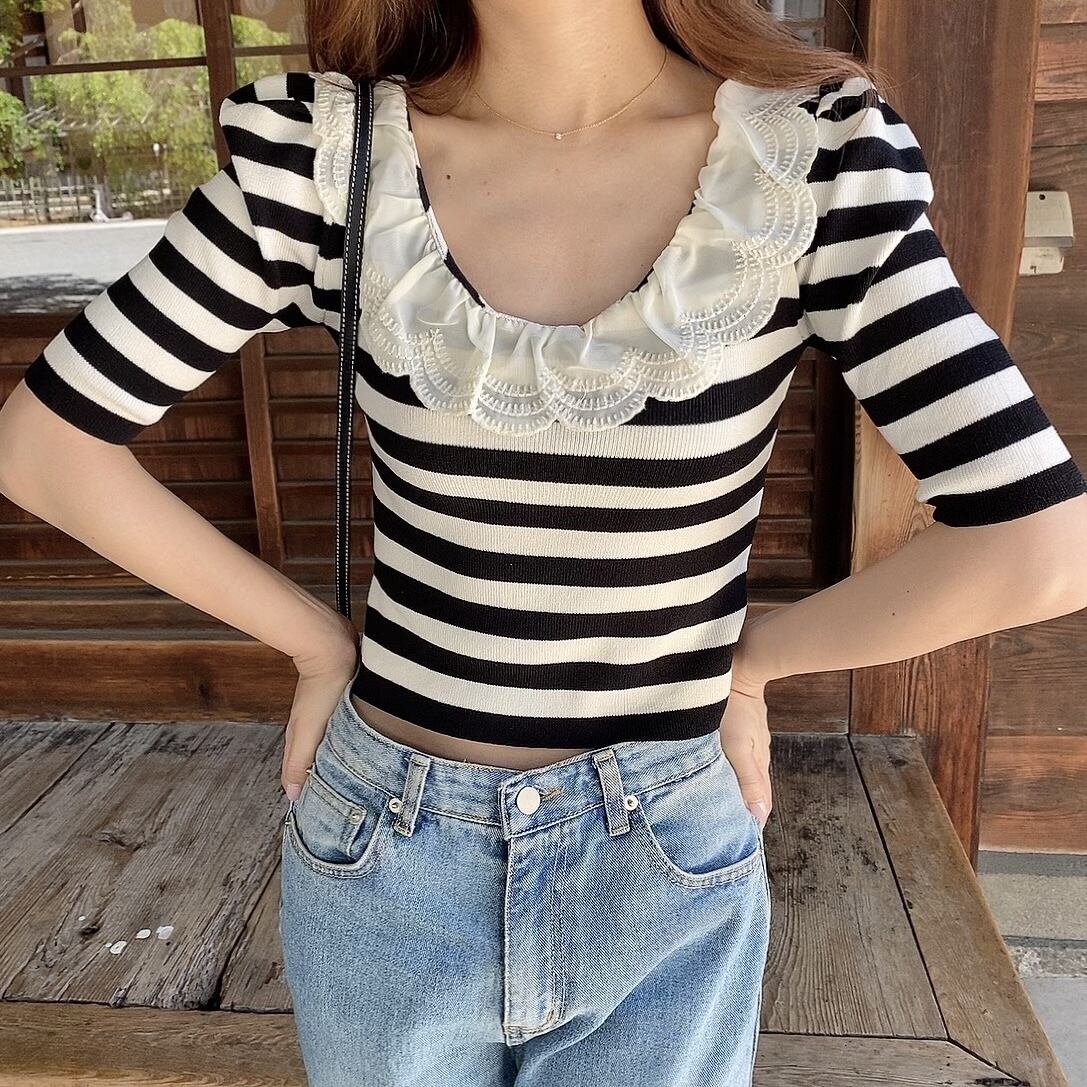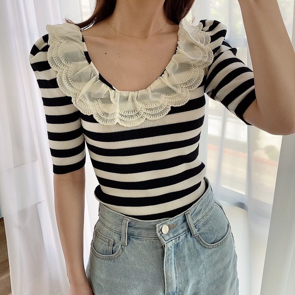 大胆に開いた胸元や、シアー感のあるポイントレースがカジュアルになりがちなボーダーも女性らしい雰囲気で楽しんでいただけます。