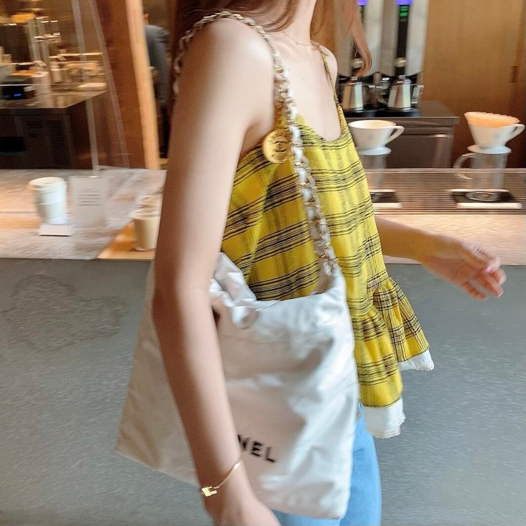 華奢見えする細めのストラップがフェミニンなのにどこか大人っぽい雰囲気に。