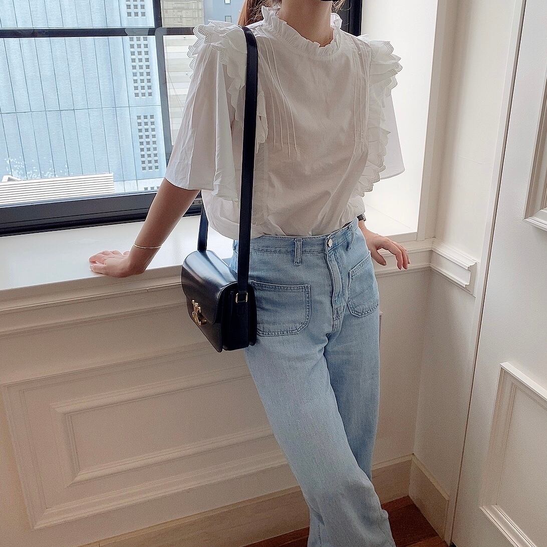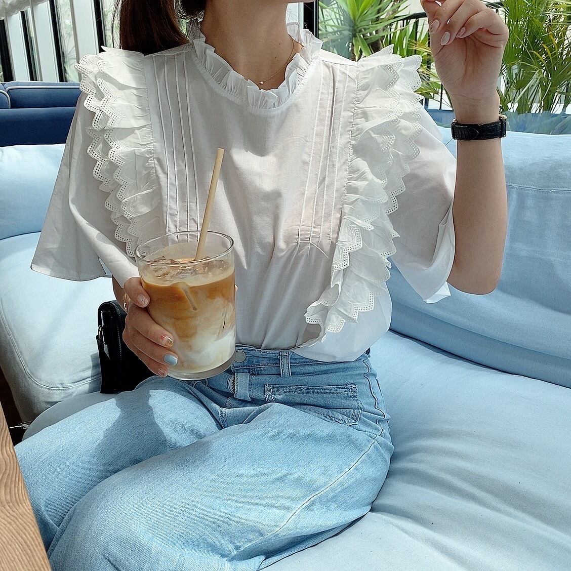 サイドにふんだんにあしらったパンチングレースが目を引くブラウス。