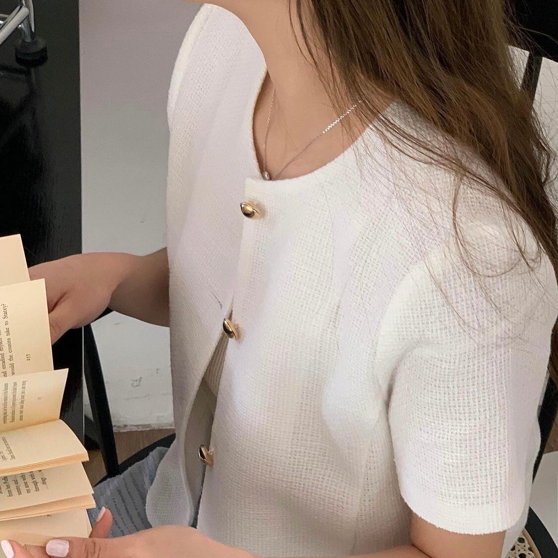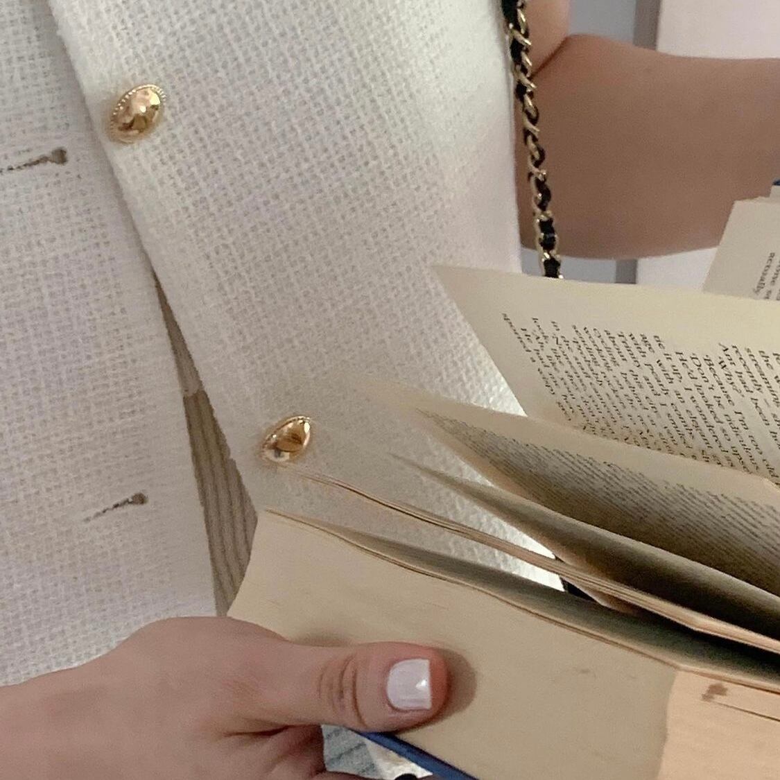 カジュアルになりすぎないよう、施されたゴールドボタンが、洗礼されたムードを引き出してくれ、女性らしい印象に。