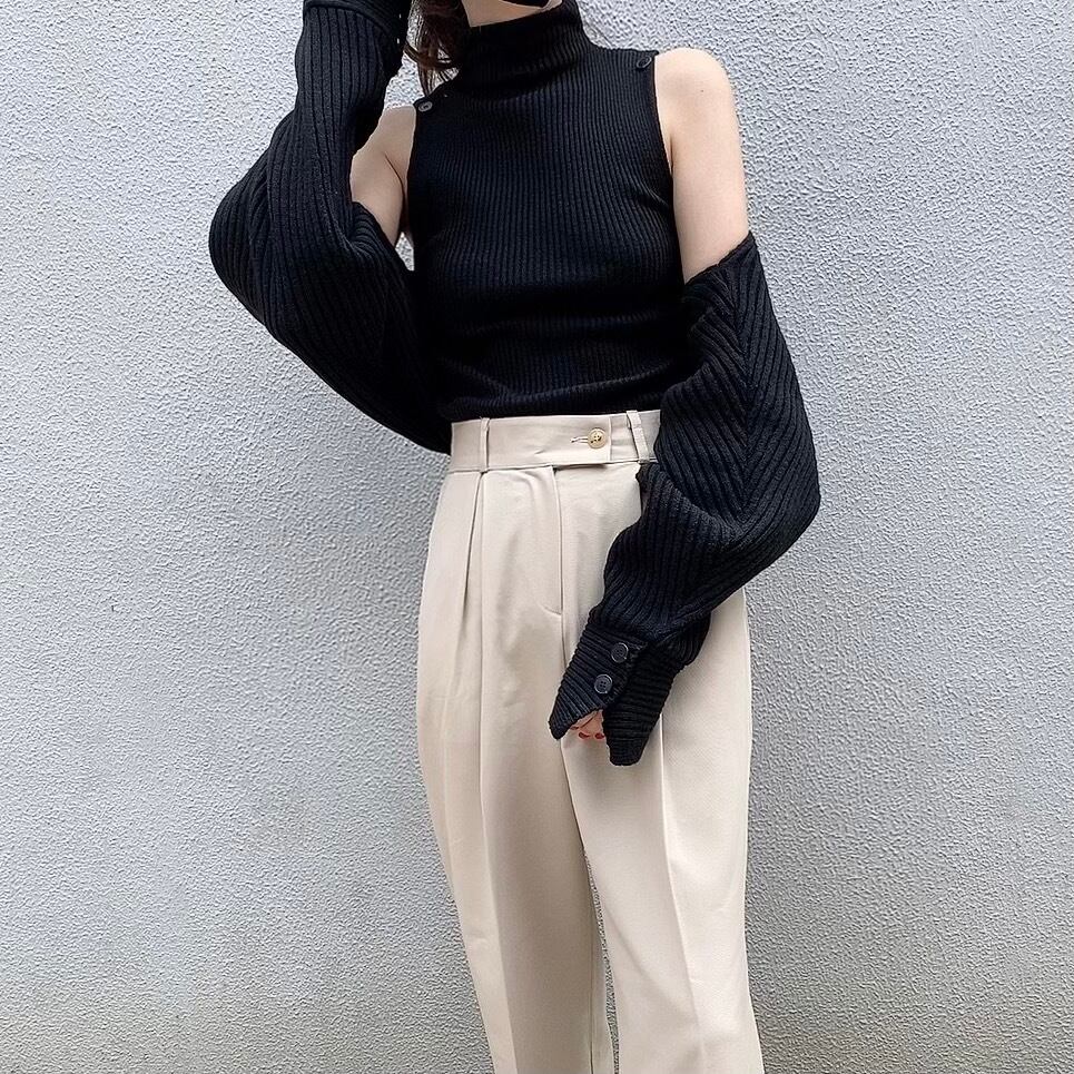 トップスのニットは縦パターンのニット編みで、女性らしいスリムなシルエットを完成させてくれます。ボレロカーディガンはたっぷりと余裕のあるデザインで、ボリューム感のある着用ができる可愛い仕上がりとなっております。ボレロカーディガンとノースリーブのボタンは、オープンクロージングが可能で、ずり落ちないよう安心感のある着用ができます。