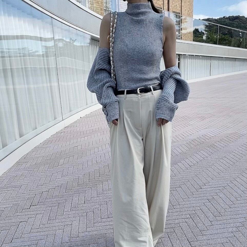 トップスのニットは縦パターンのニット編みで、女性らしいスリムなシルエットを完成させてくれます。ボレロカーディガンはたっぷりと余裕のあるデザインで、ボリューム感のある着用ができる可愛い仕上がりとなっております。ボレロカーディガンとノースリーブのボタンは、オープンクロージングが可能で、ずり落ちないよう安心感のある着用ができます。