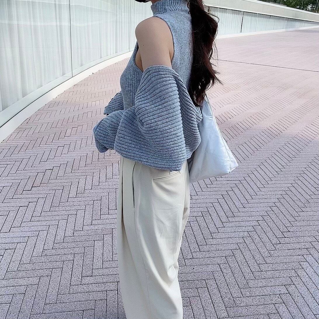 ノースリーブのニットとたっぷりボリューム感のあるボレロがセットになっており、個々での着用も映える一枚。