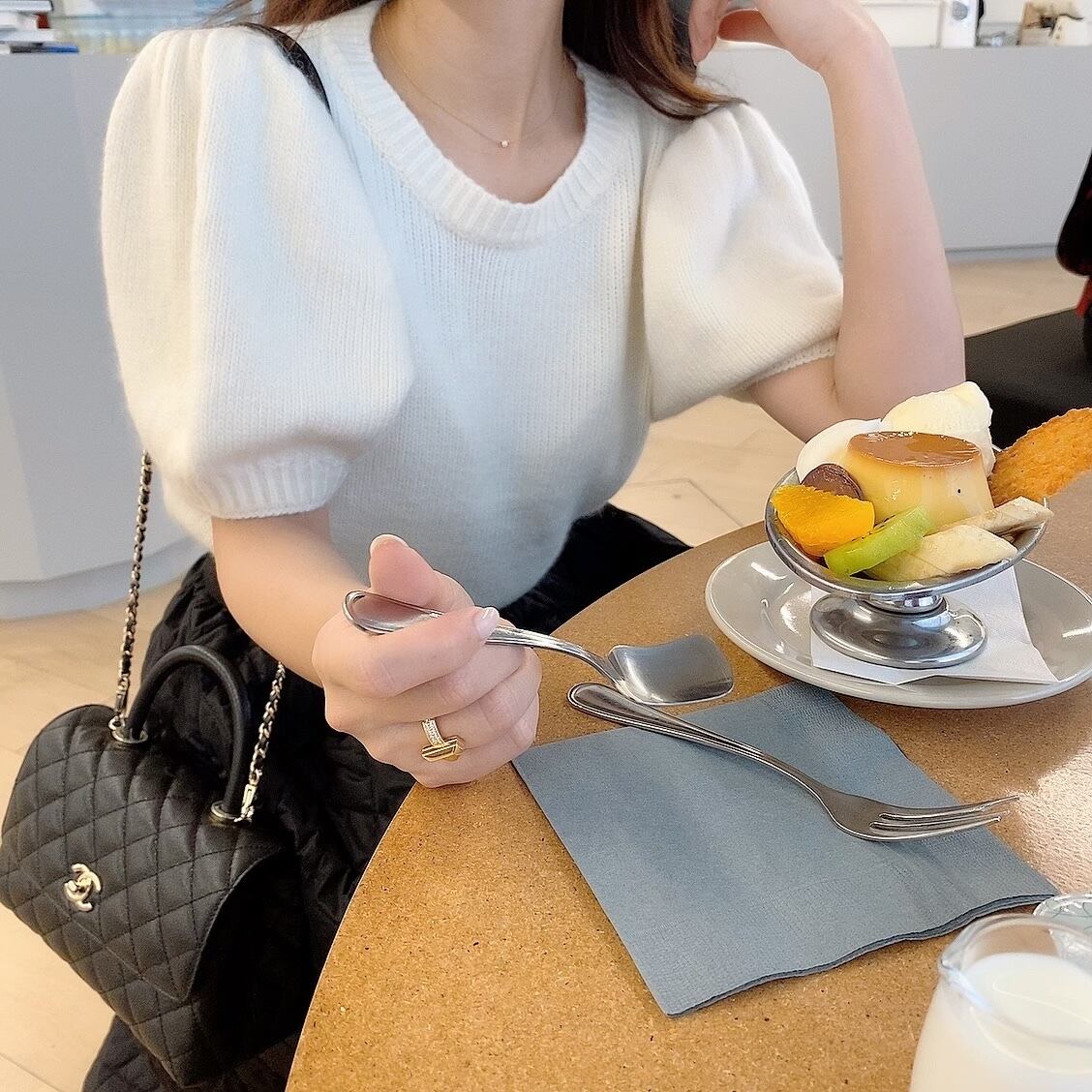 パフデザインで可愛らしさを感じられる半袖ニットとアームウォームデザインでスタイリッシュさを込めた2点セットのニットトップス。