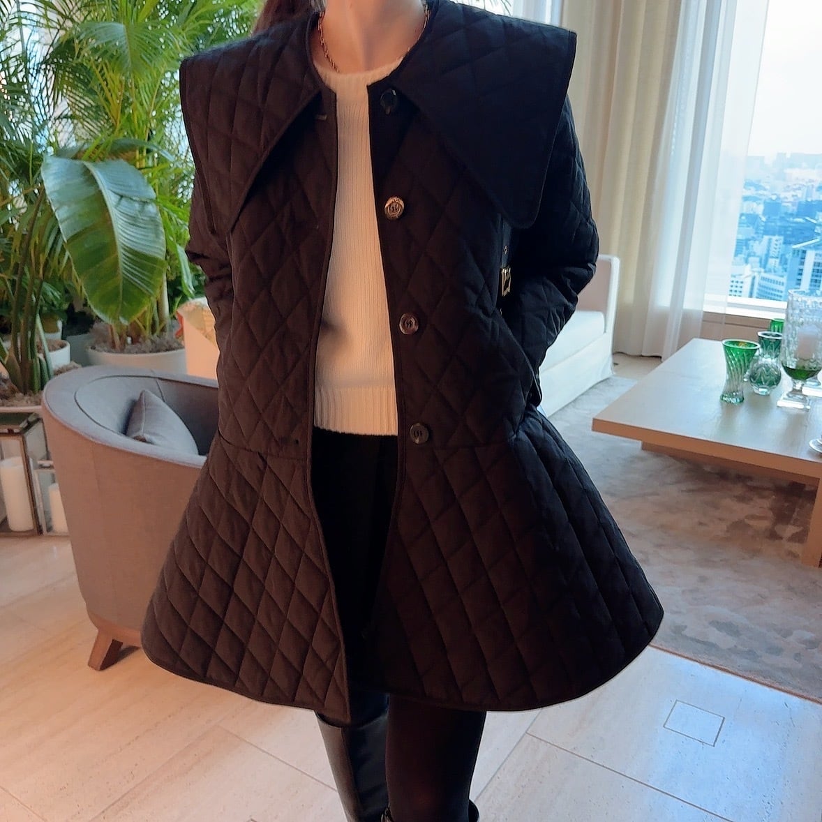 大きめの襟が大人かわいい、トレンドのキルティングコート。