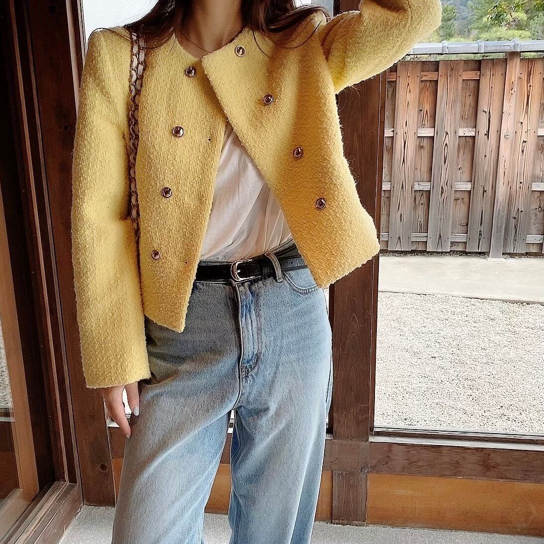 ビタミンカラーが今期トレンドのツイードジャケット。すっきりとしたノーカラーデザインと、ややゆとりのある身頃のシルエットで女性らしさと、カジュアルな要素をプラス。