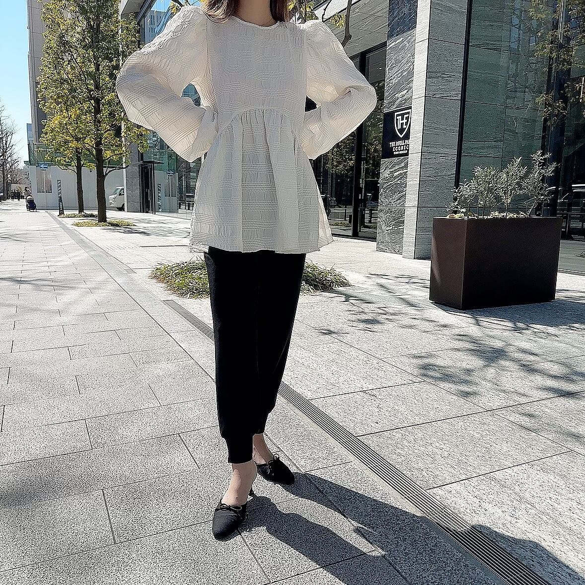 ふわっと立ち上がるパフスリーブで大人かわいいスタイリングに。