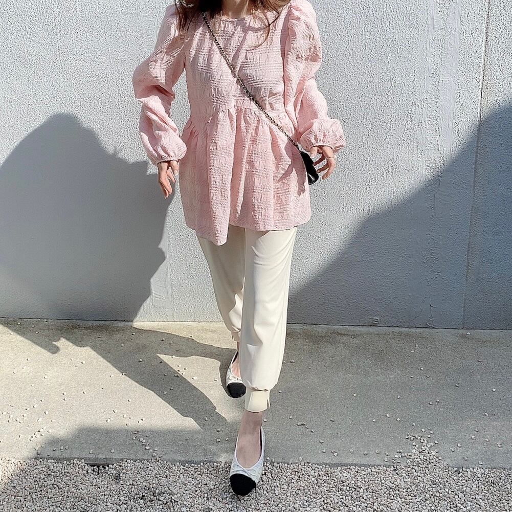 ふわっと立ち上がるパフスリーブで大人かわいいスタイリングに。