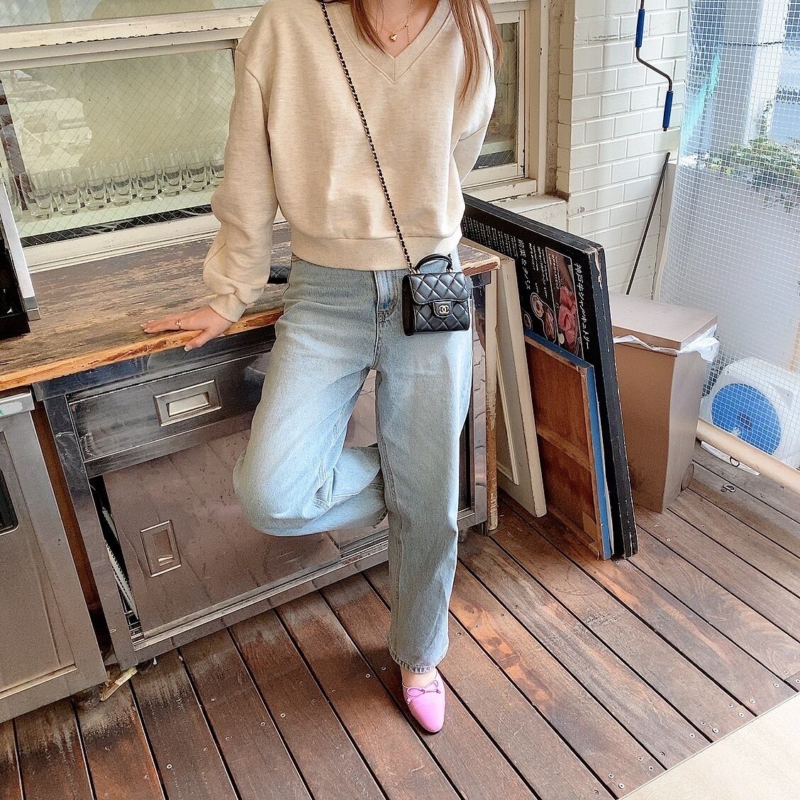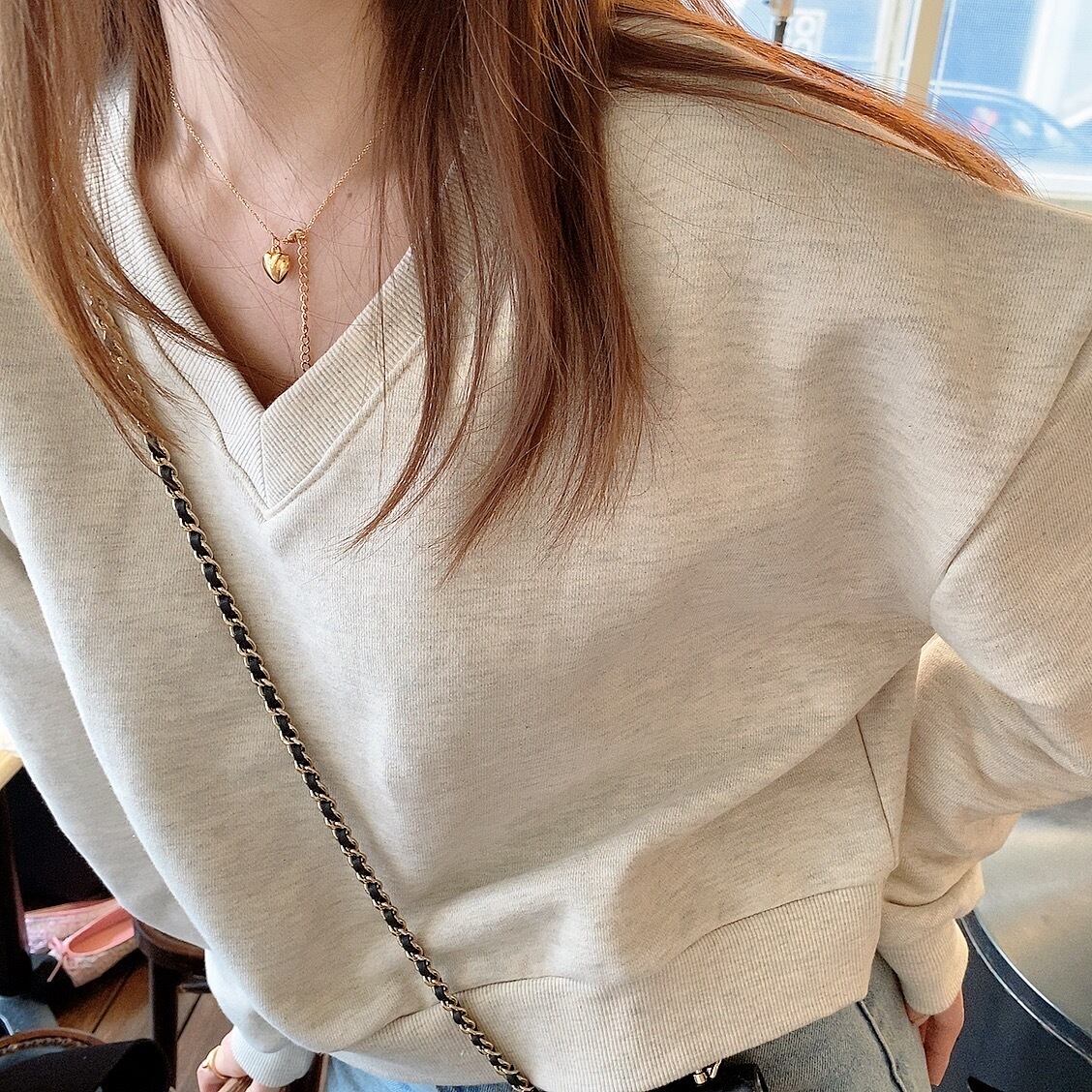 カジュアルになりがちなスウェット素材のトップスですが、抜け感のある深めのVネックが女性らしさをプラスしてくれます。