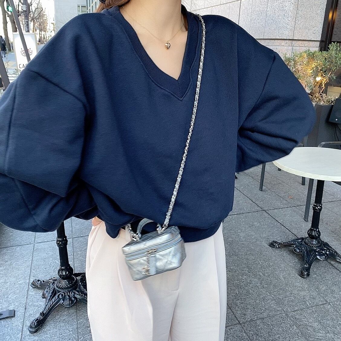 カジュアルになりがちなスウェット素材のトップスですが、抜け感のある深めのVネックが女性らしさをプラスしてくれます。