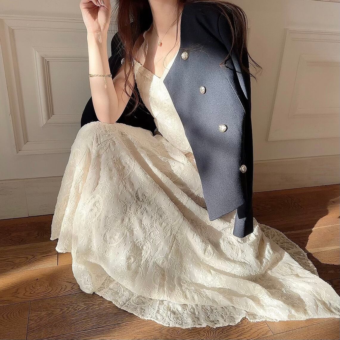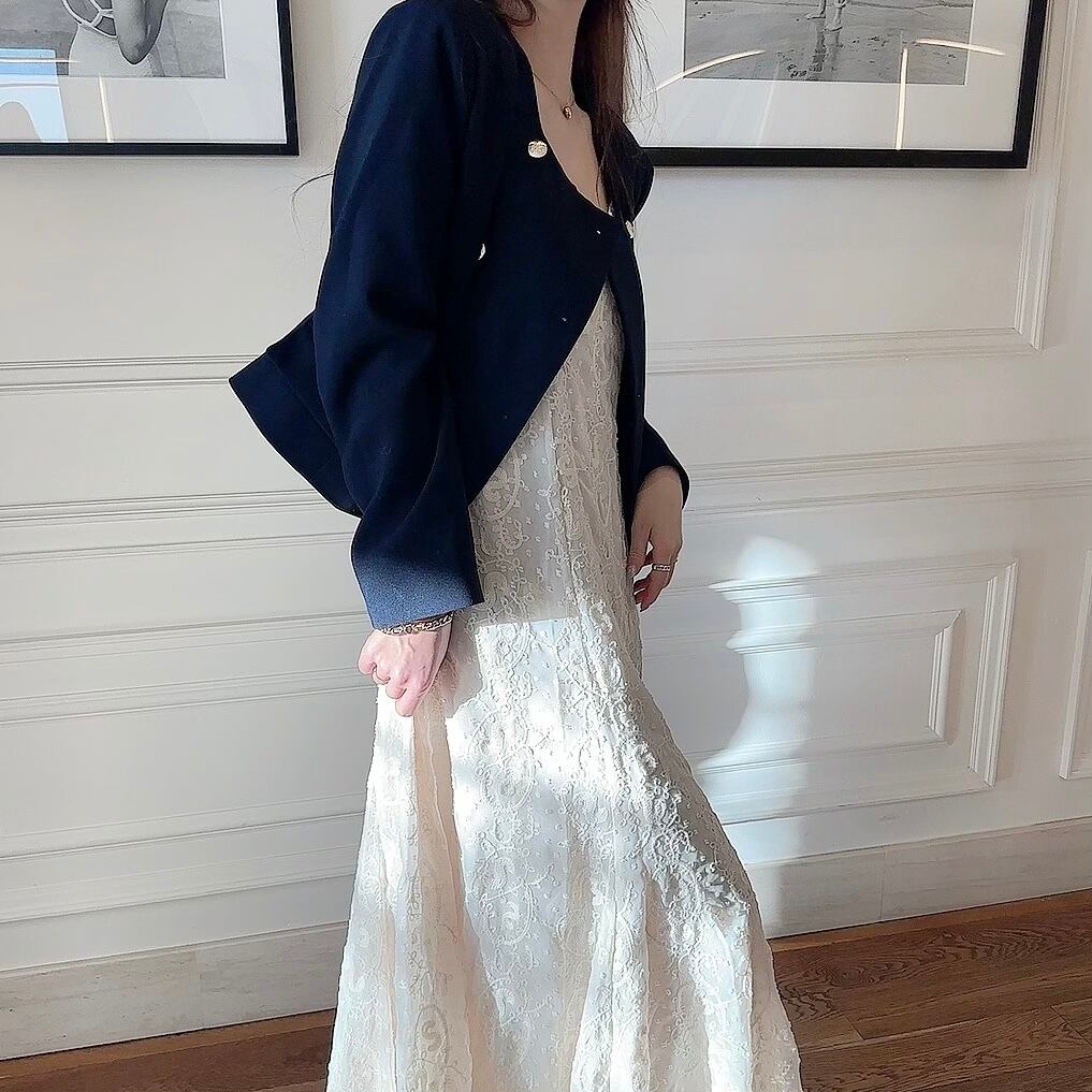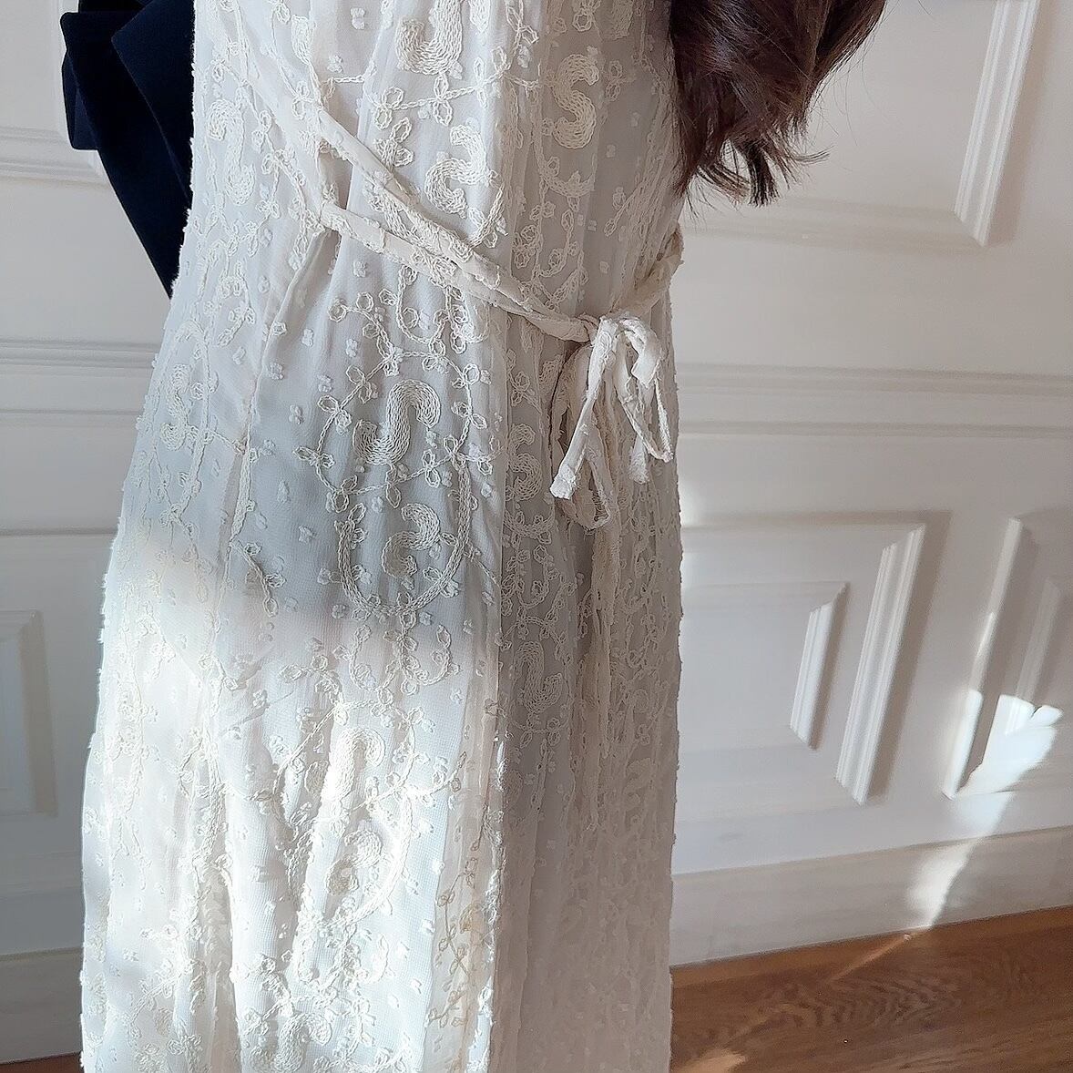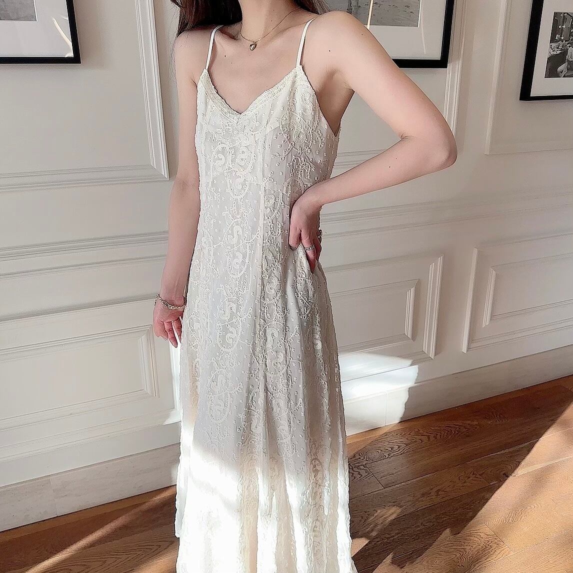 全体に施されたレースのディテールがロマンチックなロングドレス。