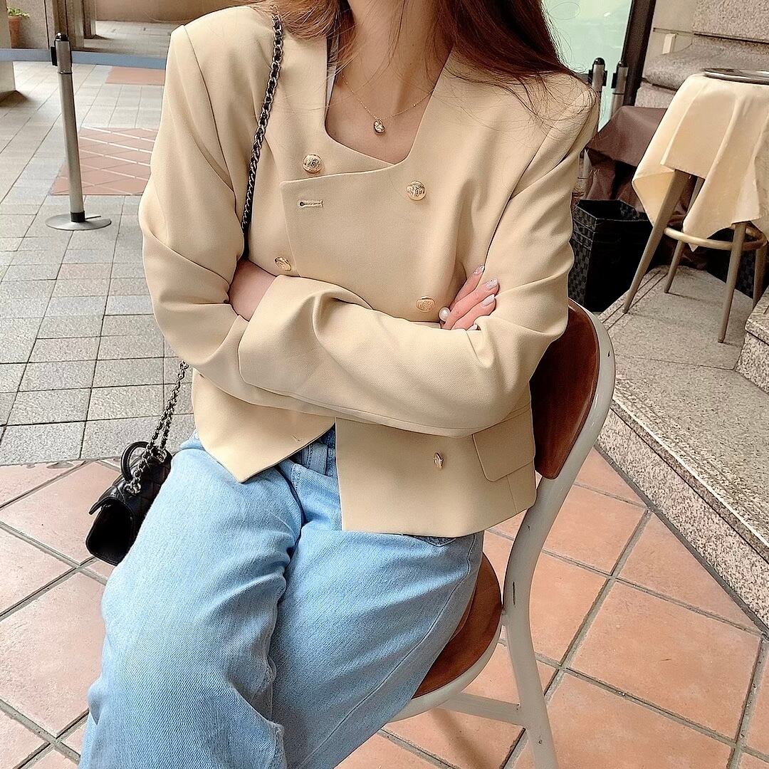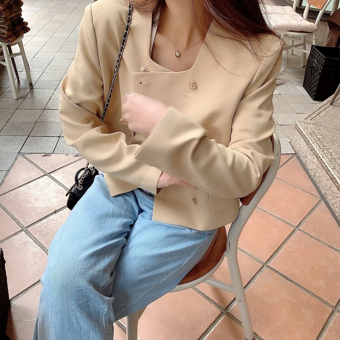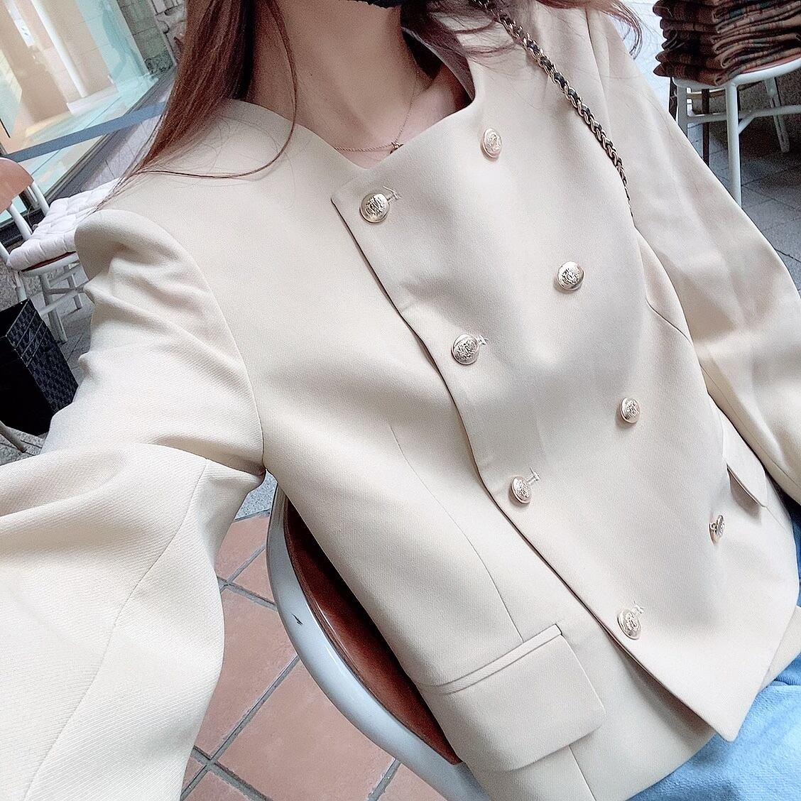 鎖骨ラインを美しく、首をすらっと長く見せてくれるスクエアネックのジャケット。