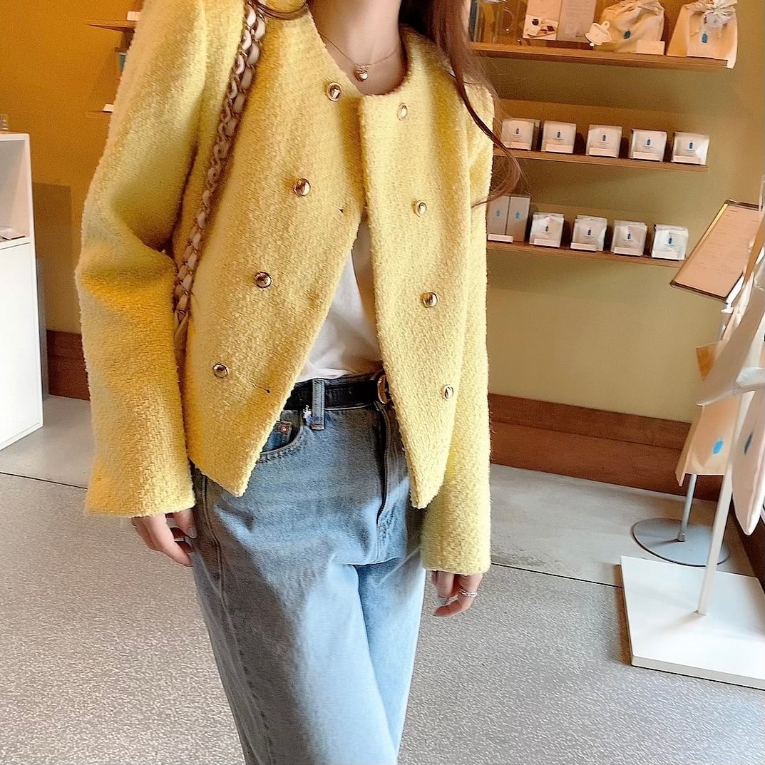 ビタミンカラーが今期トレンドのツイードジャケット。すっきりとしたノーカラーデザインと、ややゆとりのある身頃のシルエットで女性らしさと、カジュアルな要素をプラス。