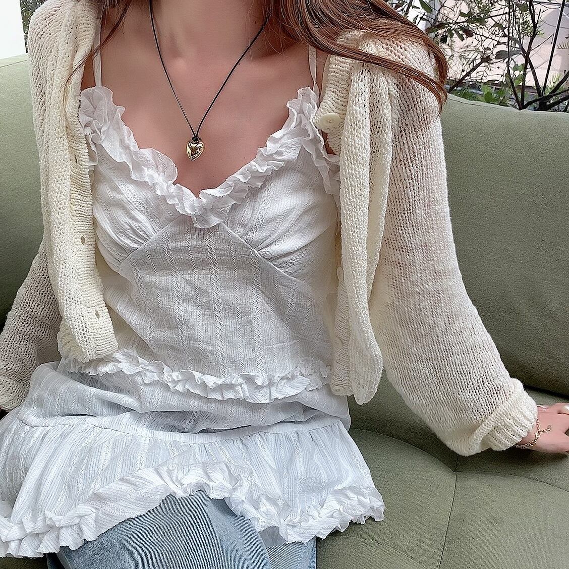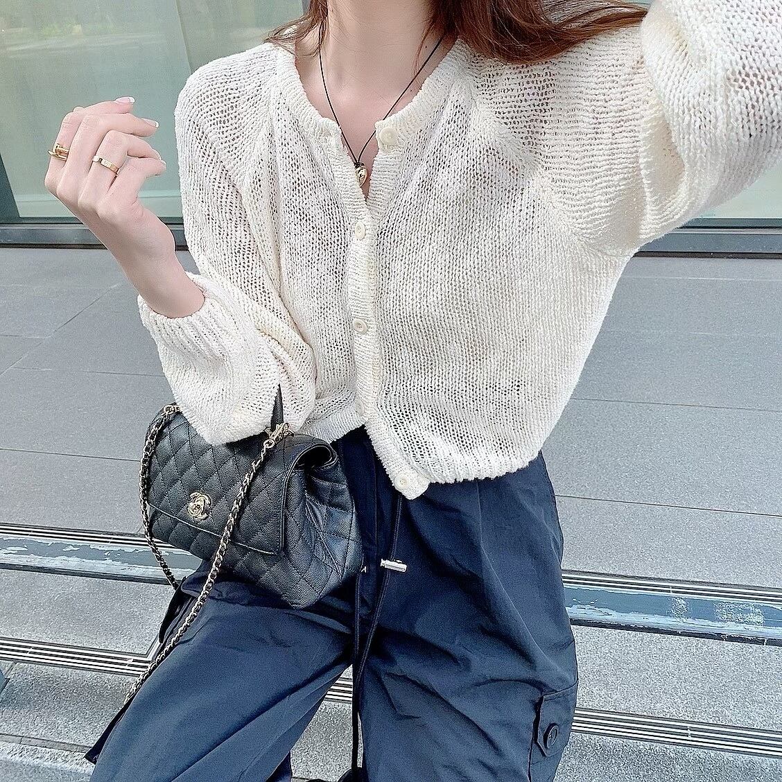 ベーシックなデザインながらも、きれいで柔らかな色味が魅力的なニットカーディガン。ほのかなボリューム感と肉厚が感じられるニーティング素材がポイントになり、ゆったりとした透かし編みで熱がこもらず快適に着用して頂けます。