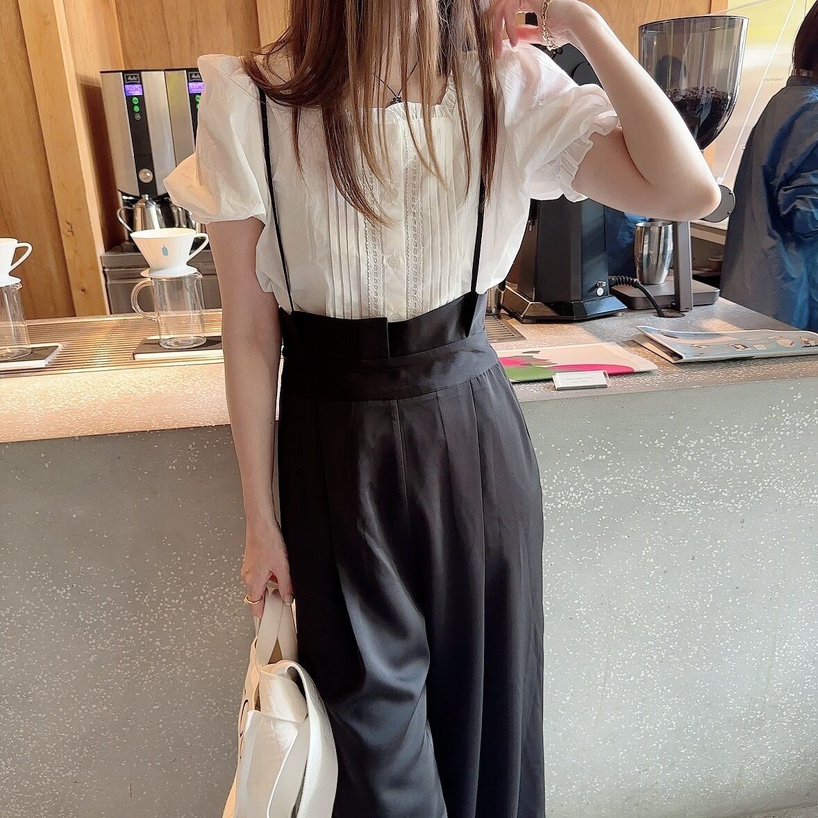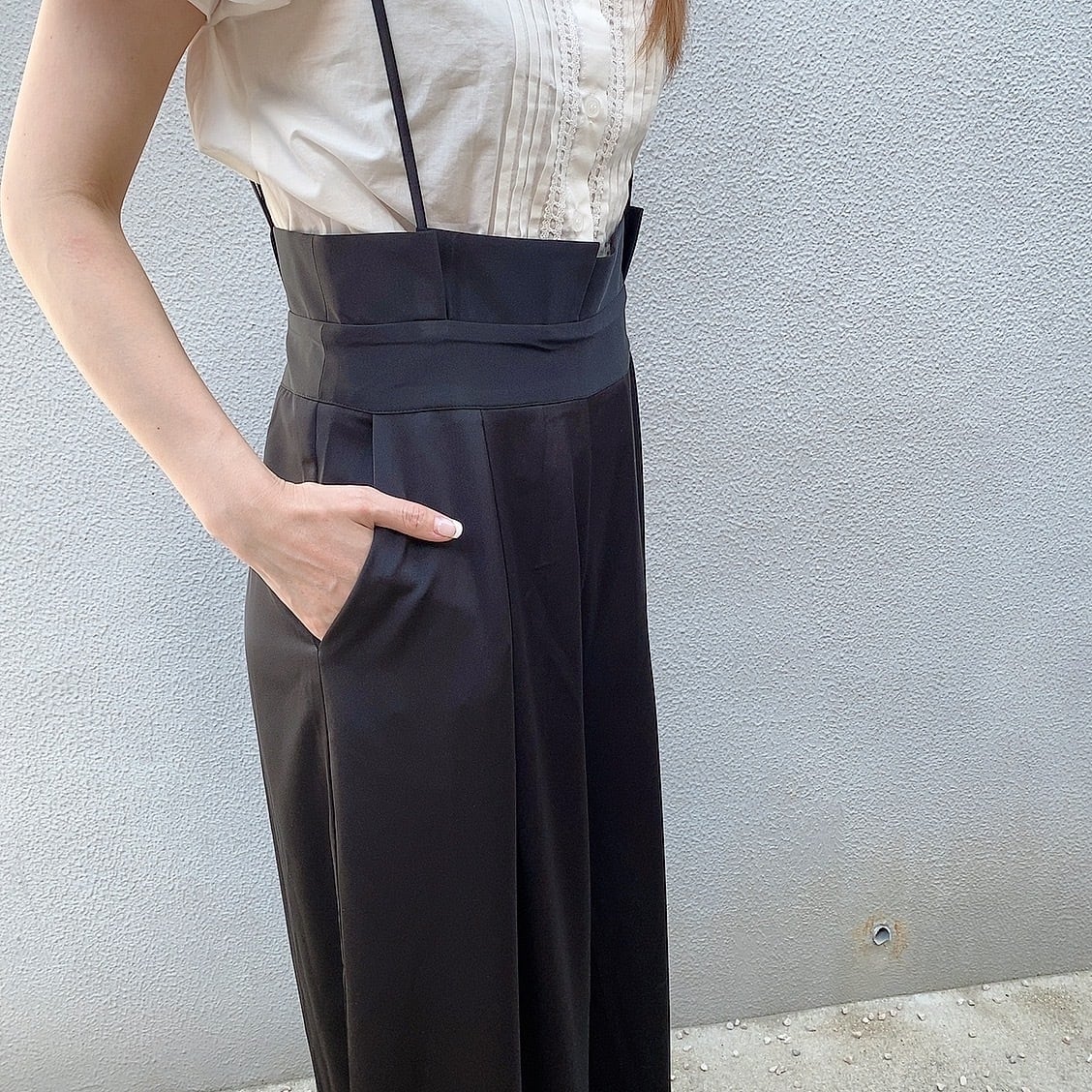 微光沢の上質なサテン素材が、主張し過ぎず上品に履いていただけるサロペットパンツ