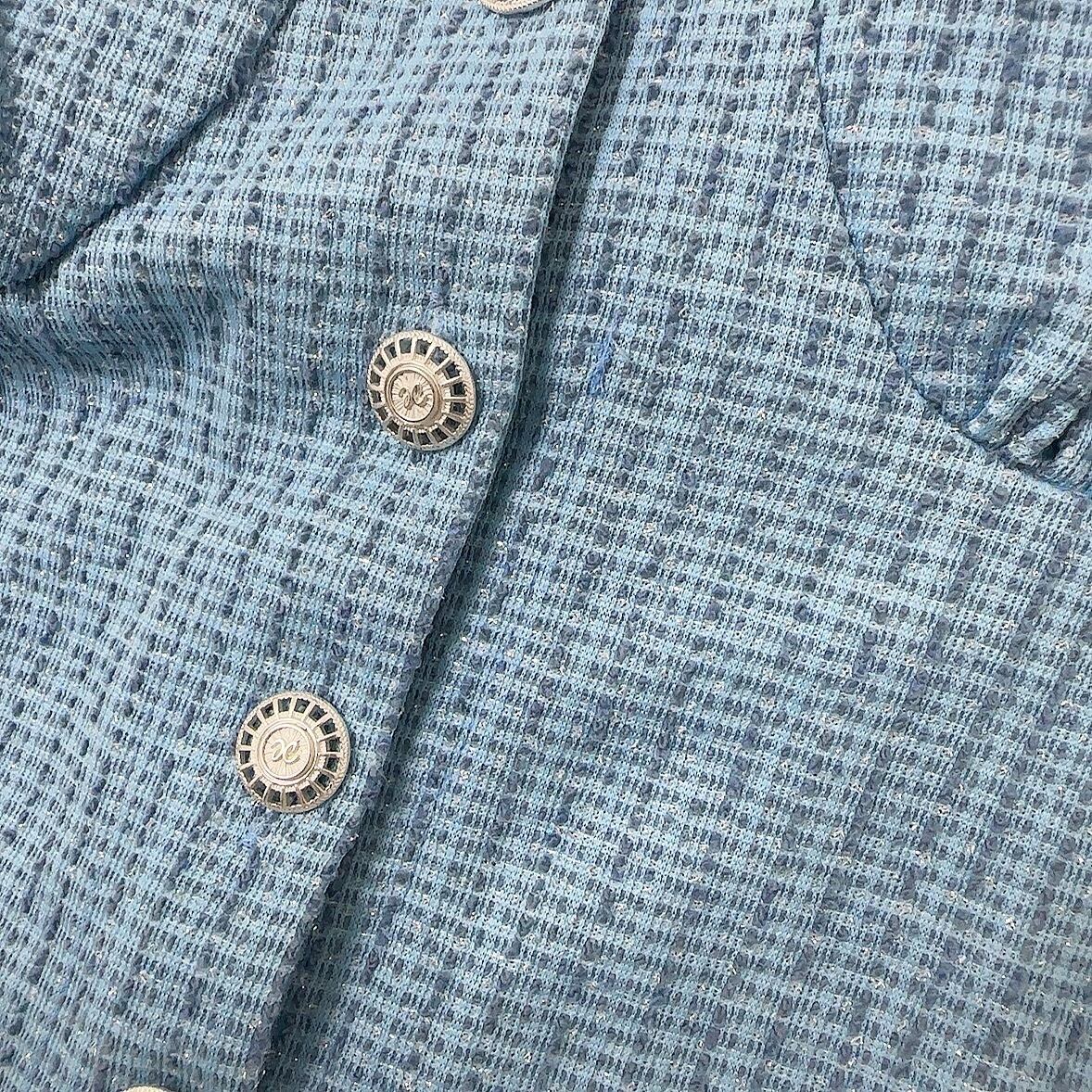 ラメ糸混のツイード素材とデザイン性のあるフロントのボタンが華やかで存在感抜群のトップス。