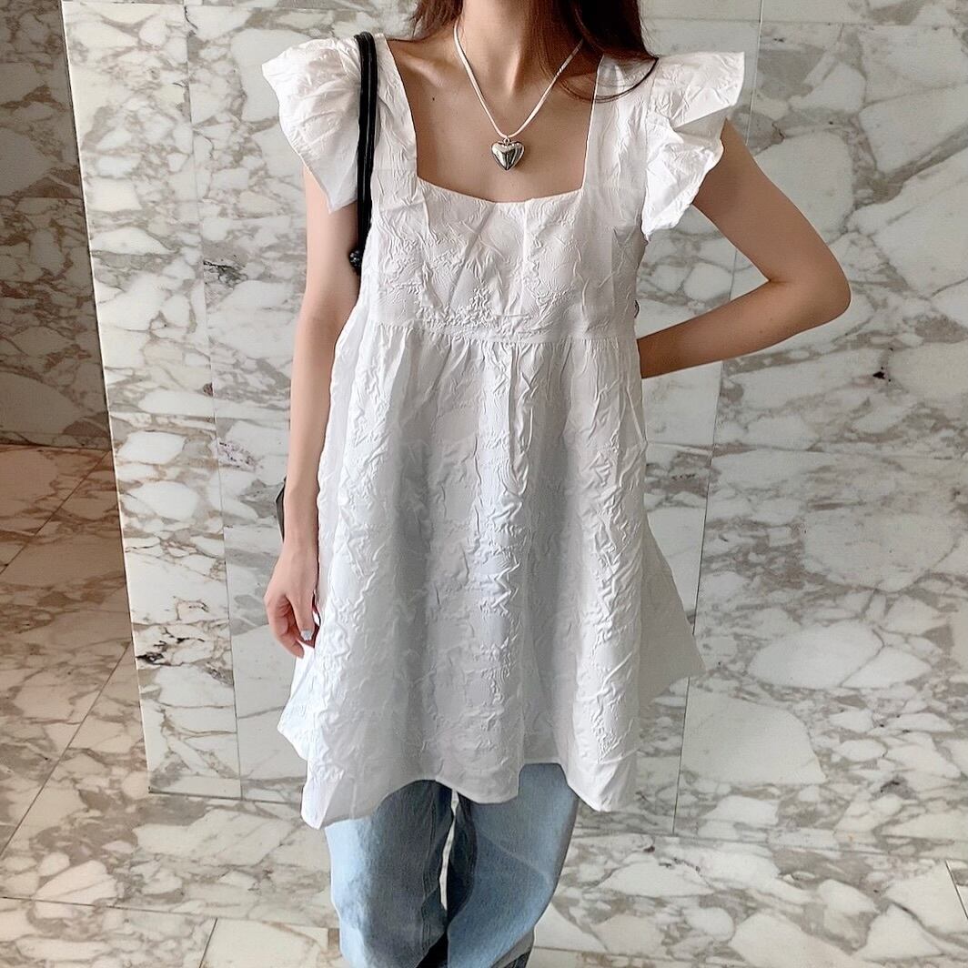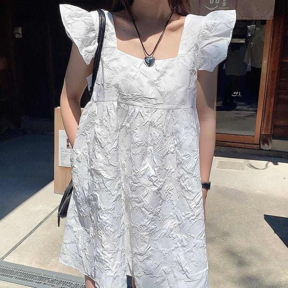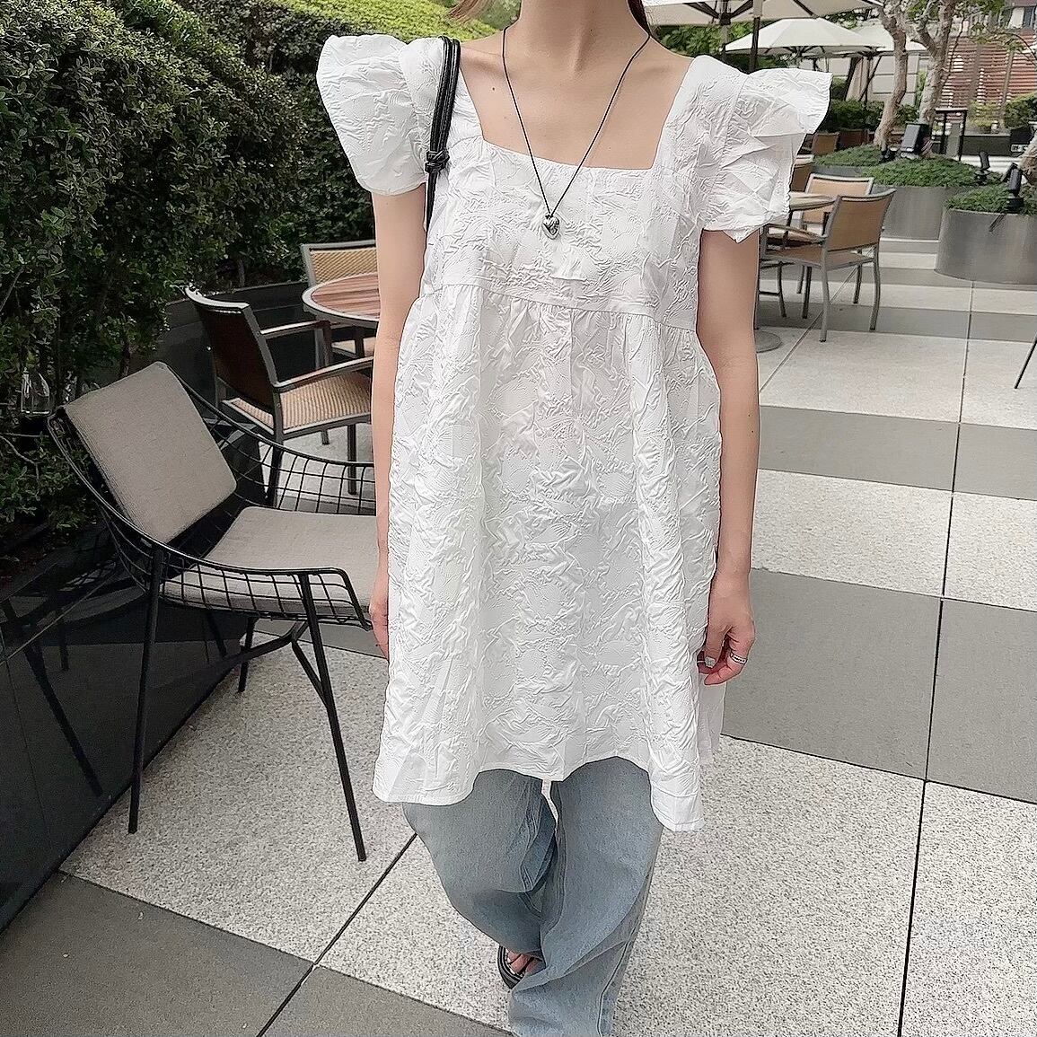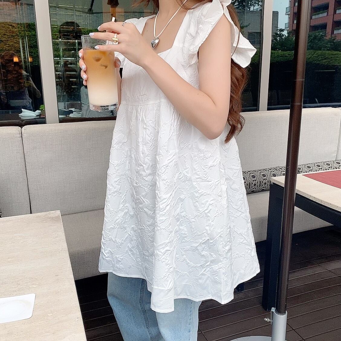 またショルダーのフリルが二の腕をカバーしてくれ、快適に着て頂けます。