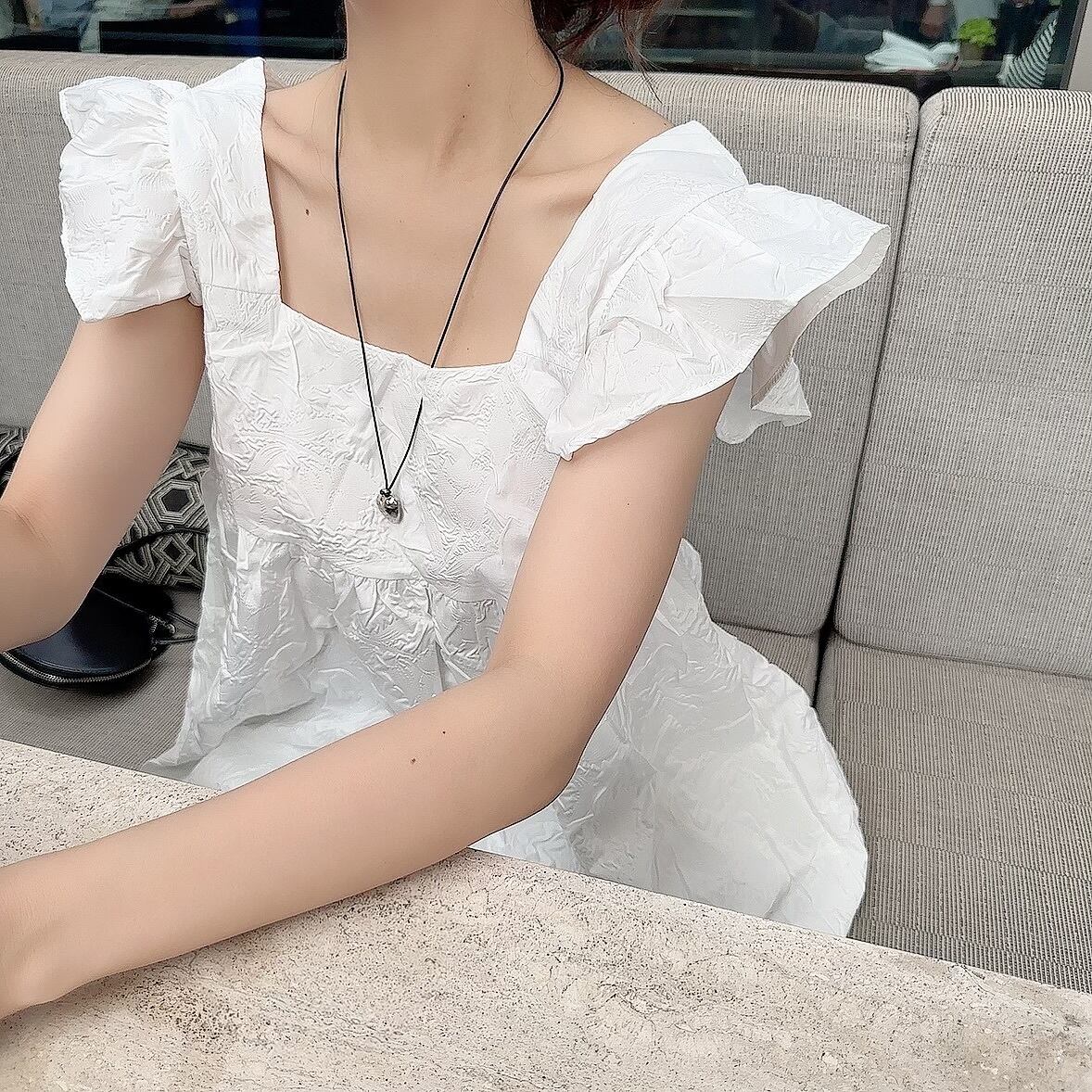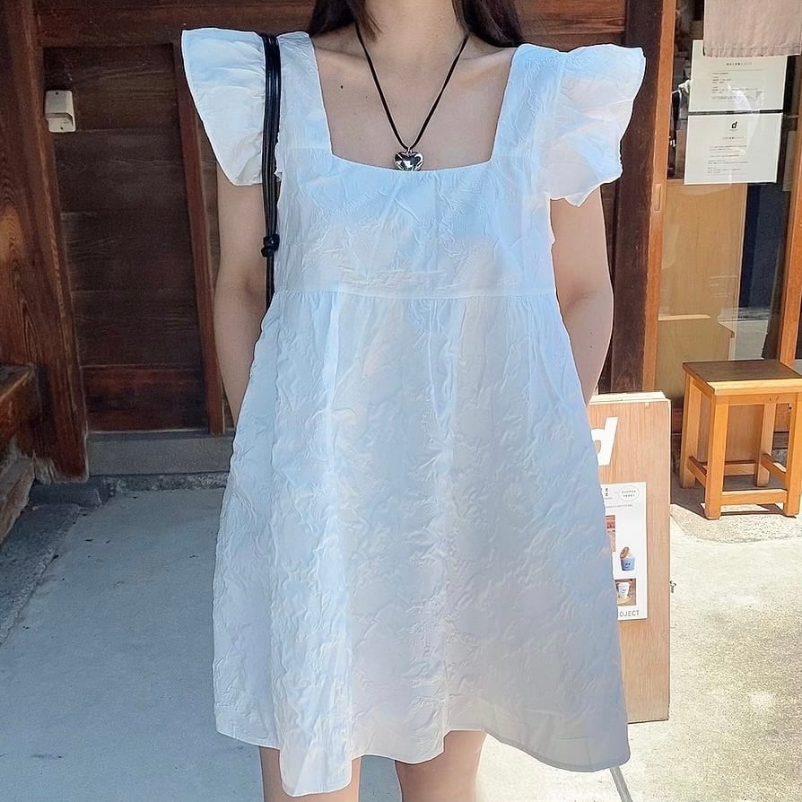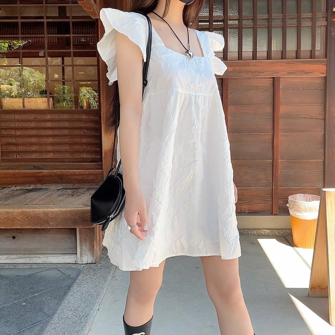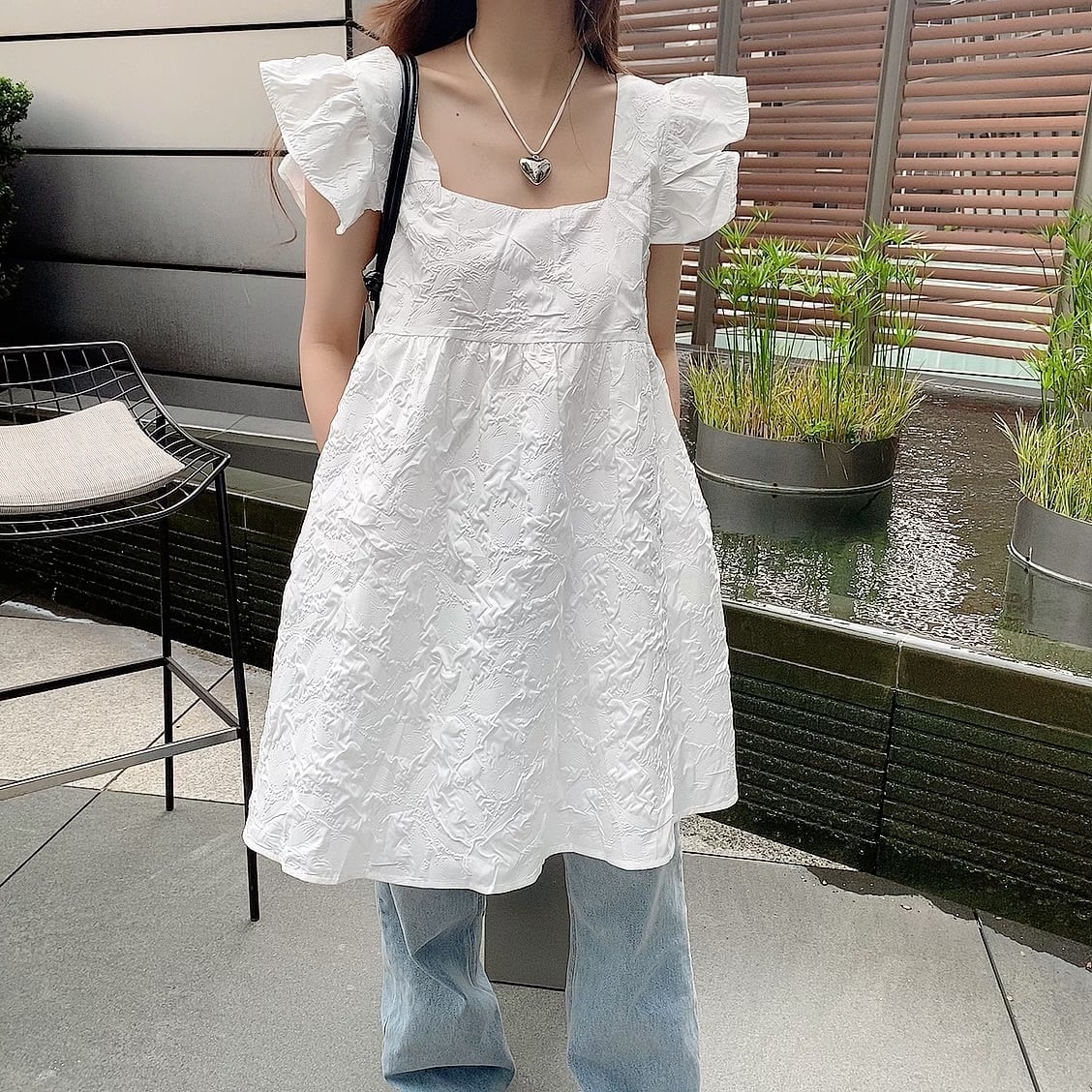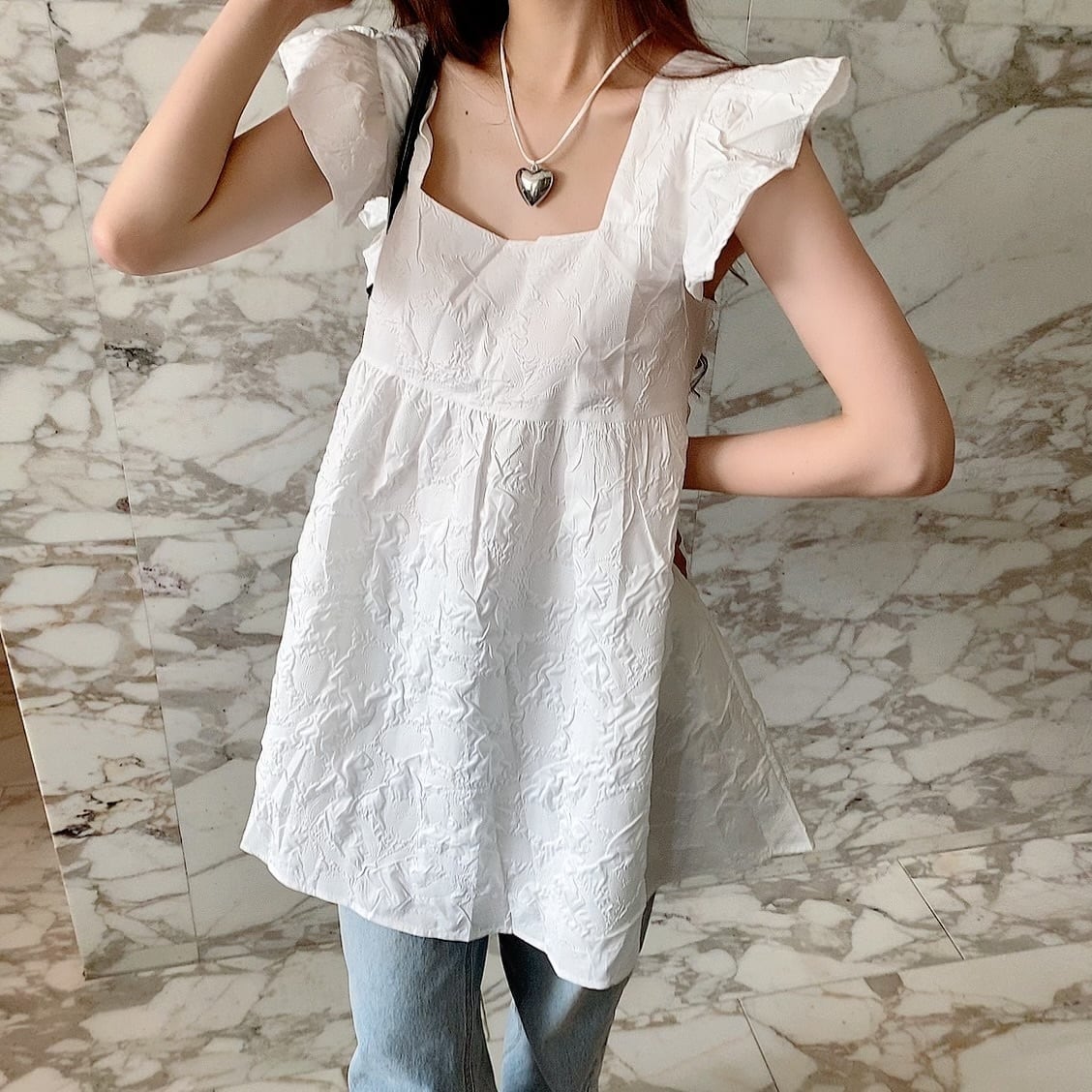 またショルダーのフリルが二の腕をカバーしてくれ、快適に着て頂けます。