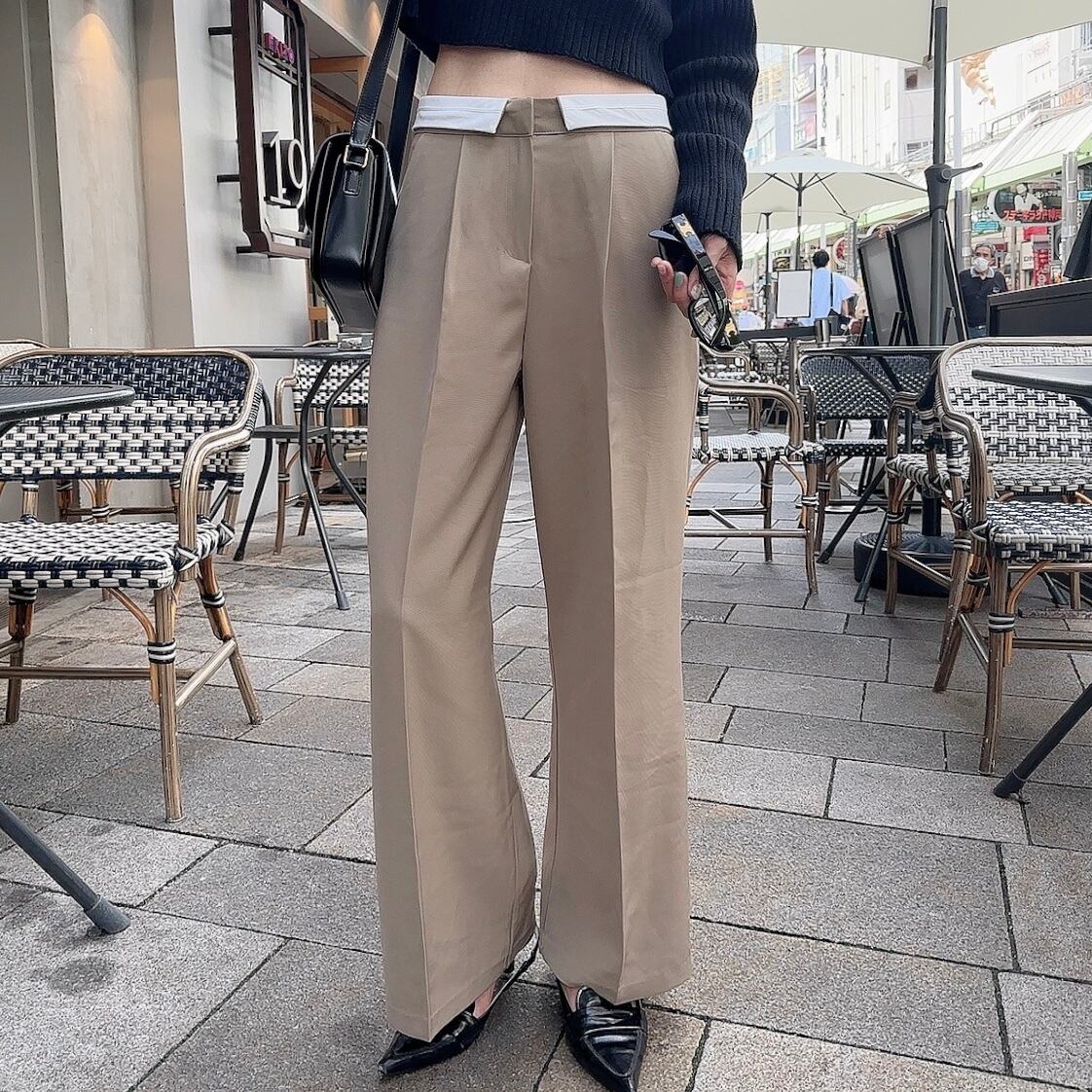 ウエストの折り返しデザインが目をひくスラックス。脚の形を拾わないすとんと落ち感のあるシルエットで気になる下半身もカバー。