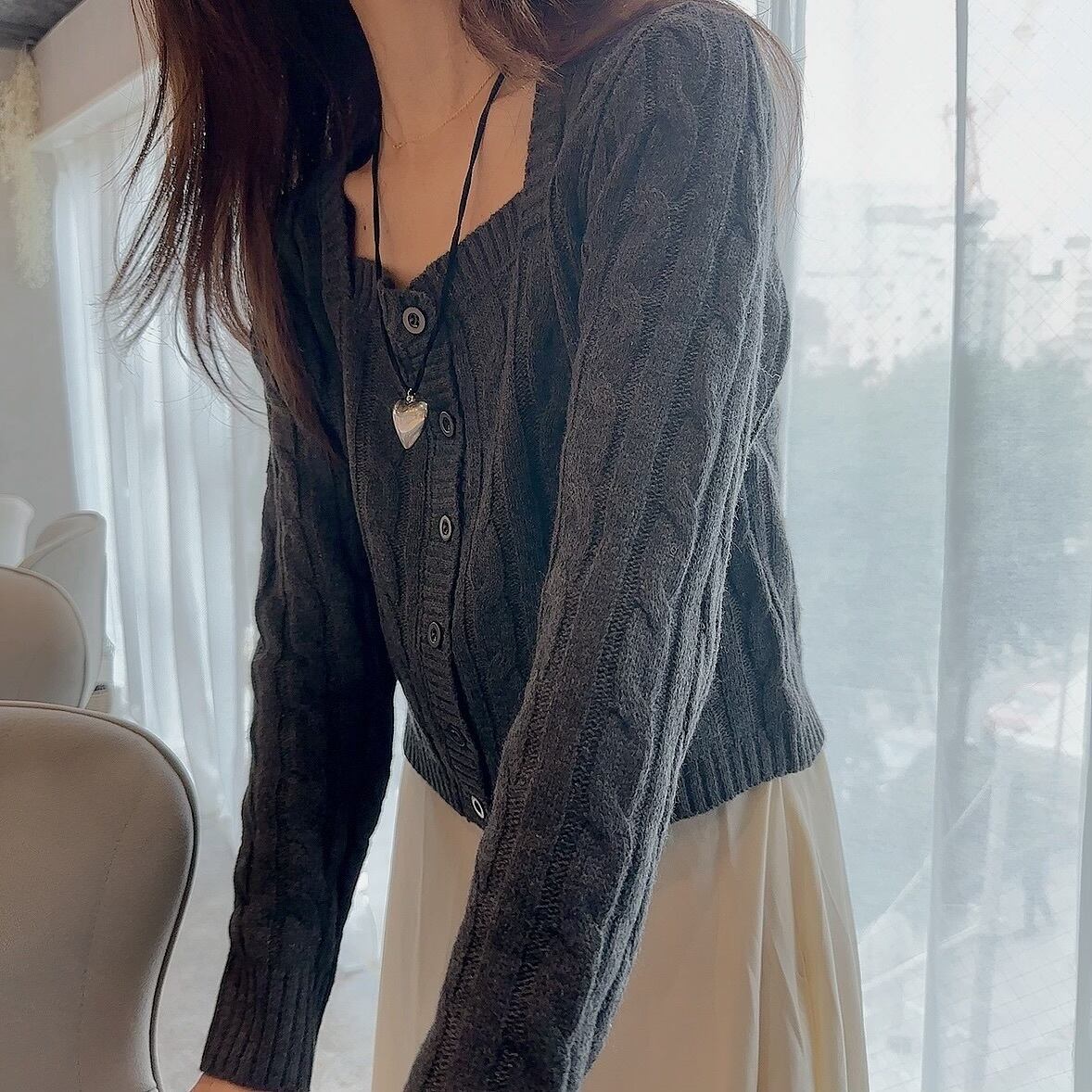 ケーブル編みで立体感のあるデザインがかわいいニットカーディガン。