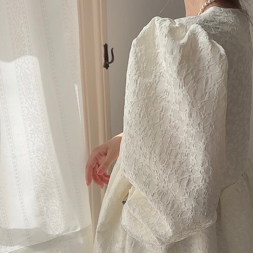 ハリ感のあるジャガード生地と立ち上がりの綺麗なパフが上品な大人可愛い印象に。