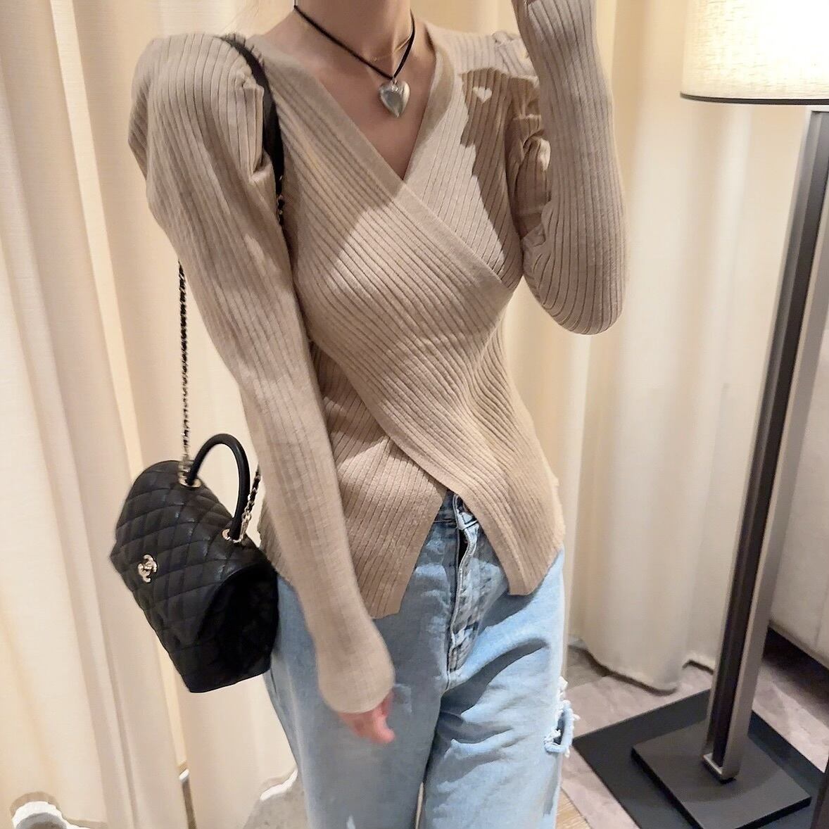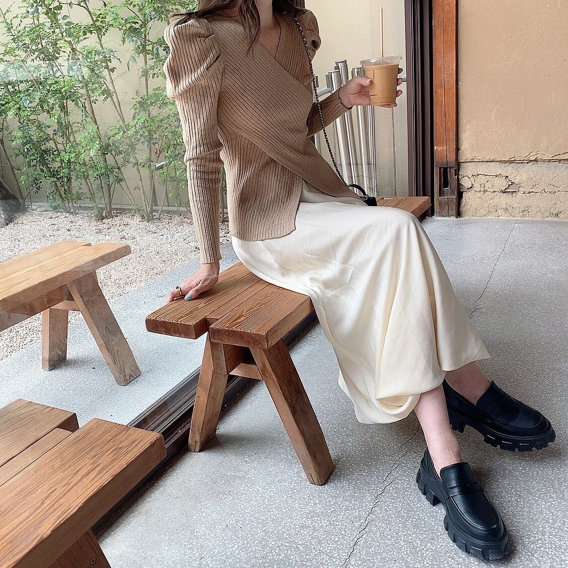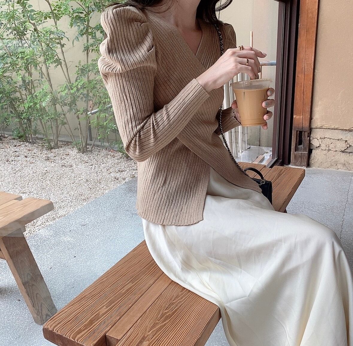 パフが可愛いカシュクールニット。肌に吸いつくような、しっとりとした柔らかい素材で、伸縮性もあり、着心地がとても良いニットです。