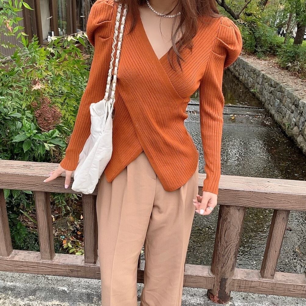 パフが可愛いカシュクールニット。肌に吸いつくような、しっとりとした柔らかい素材で、伸縮性もあり、着心地がとても良いニットです。