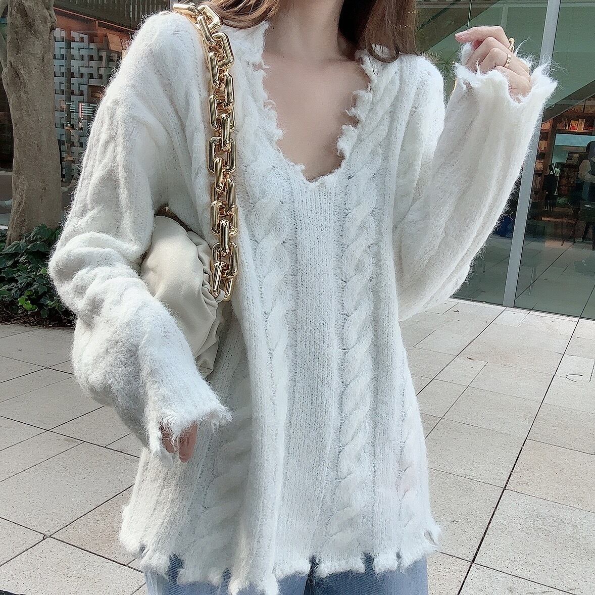 深めのVネックとルーズさのある編み地で女性らしい抜け感のあるスタイルに。