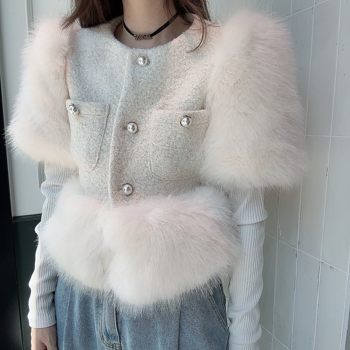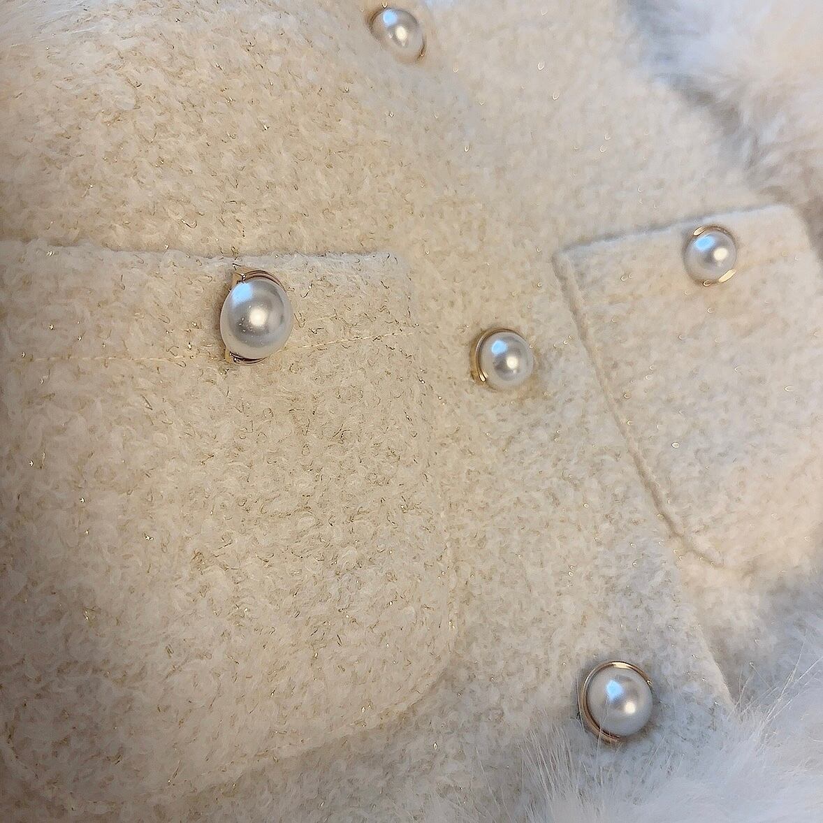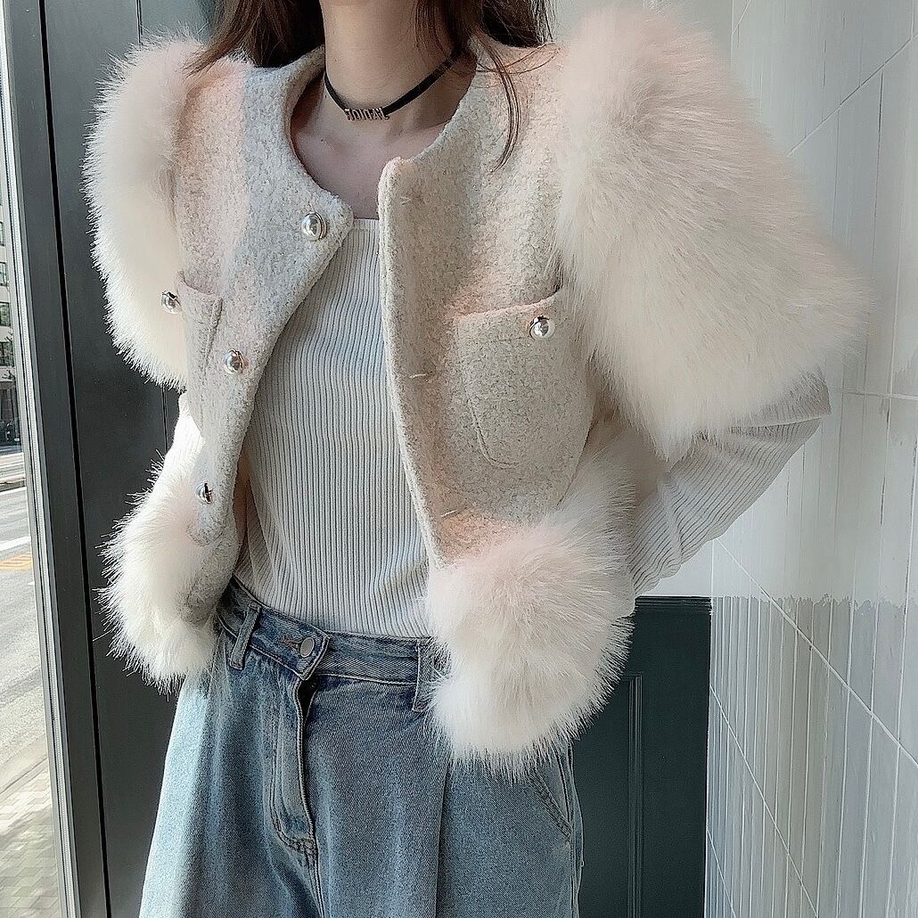 ウールのブークレツイードの素材感とファーの異素材の組み合わせがモードで高級感をプラス。