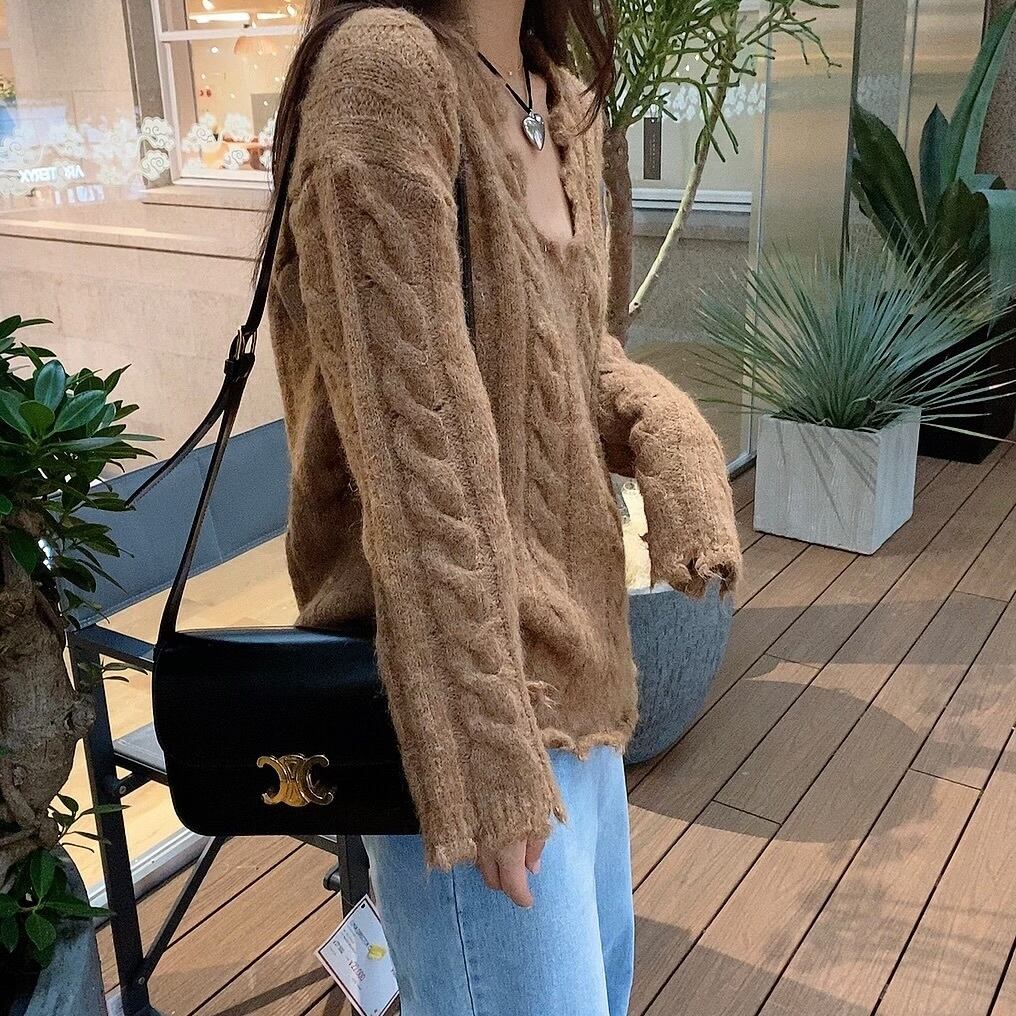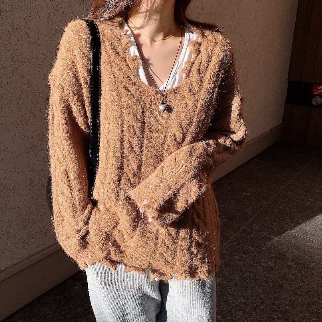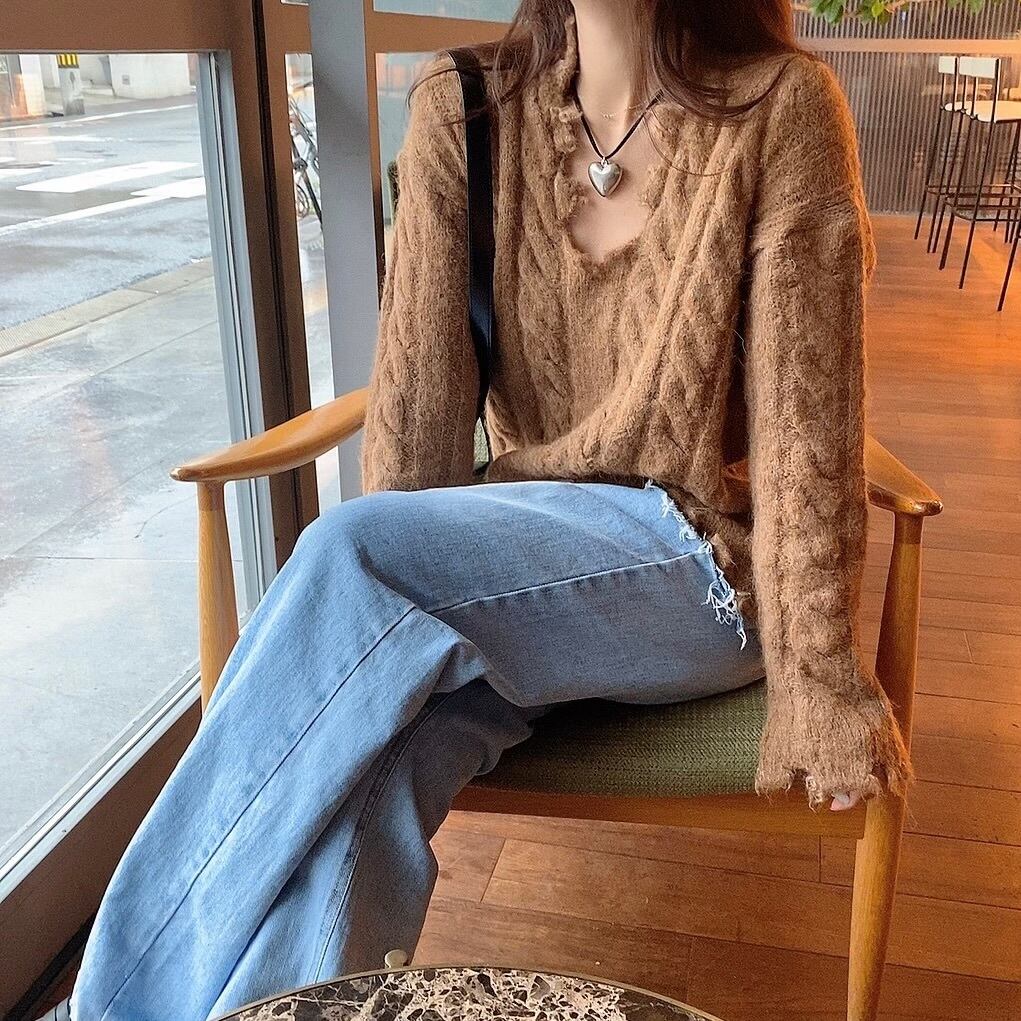深めのVネックとルーズさのある編み地で女性らしい抜け感のあるスタイルに。