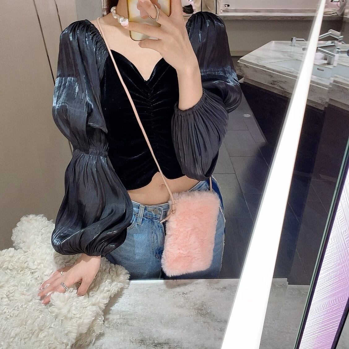 フロント部分はベロア、ボリュームのある袖は艶感のある素材となっており、動くたびに光沢感が立体的に見えモードな雰囲気に。