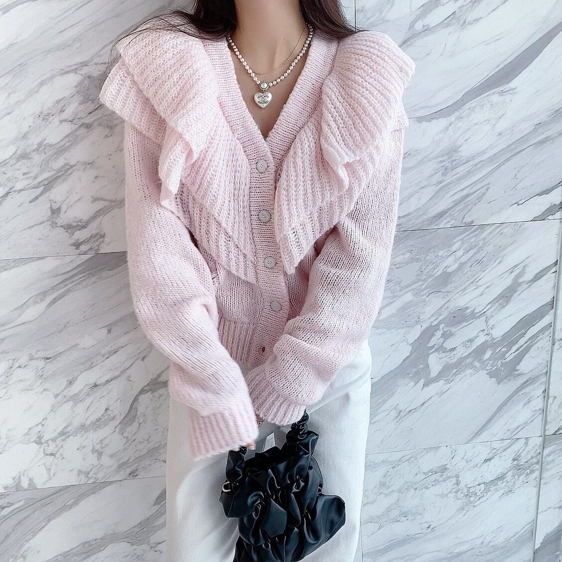 ボリュームたっぷりのフリルがコーディネートを引き立てる可愛いカーディガン。