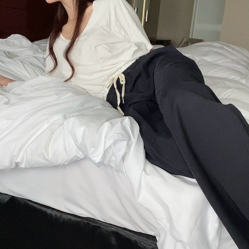 軽くローライズのように腰を落として履くのがラフで可愛く、ウエストはゴム仕様で調節していだけるストレスフリーな1着です。