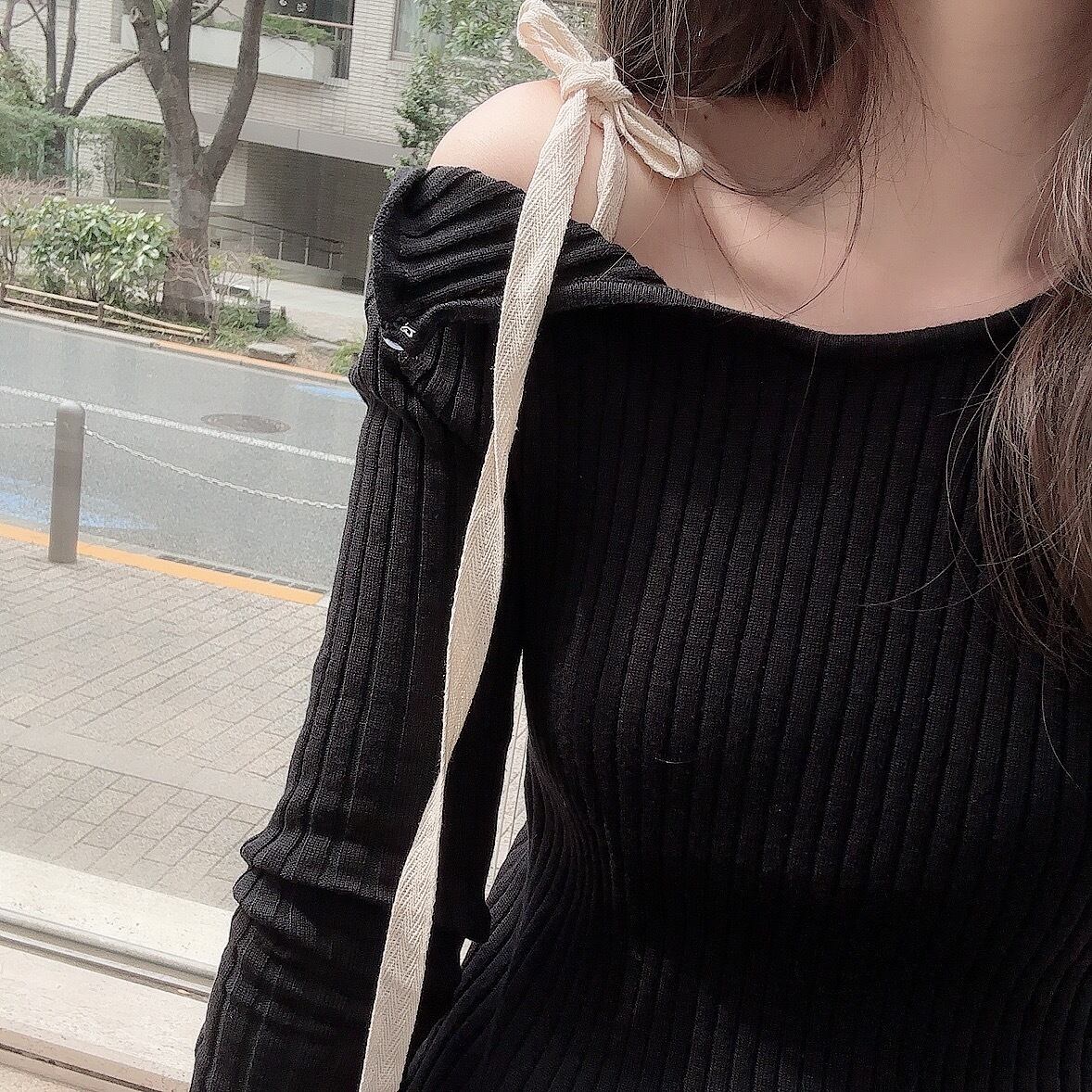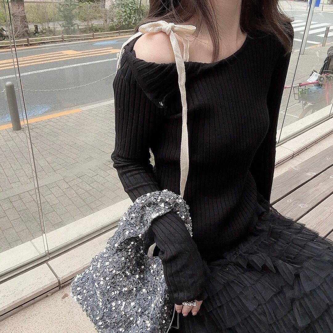 ワンショルダーのデザインと素材違いのアイボリーカラーの肩リボンがポイントのリブニット。