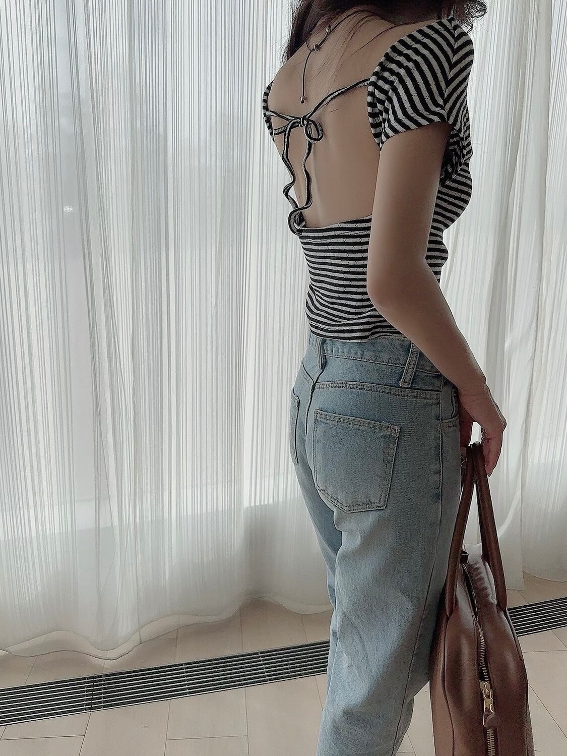 大胆なバックオープンディティールとリボンが可愛いtee。