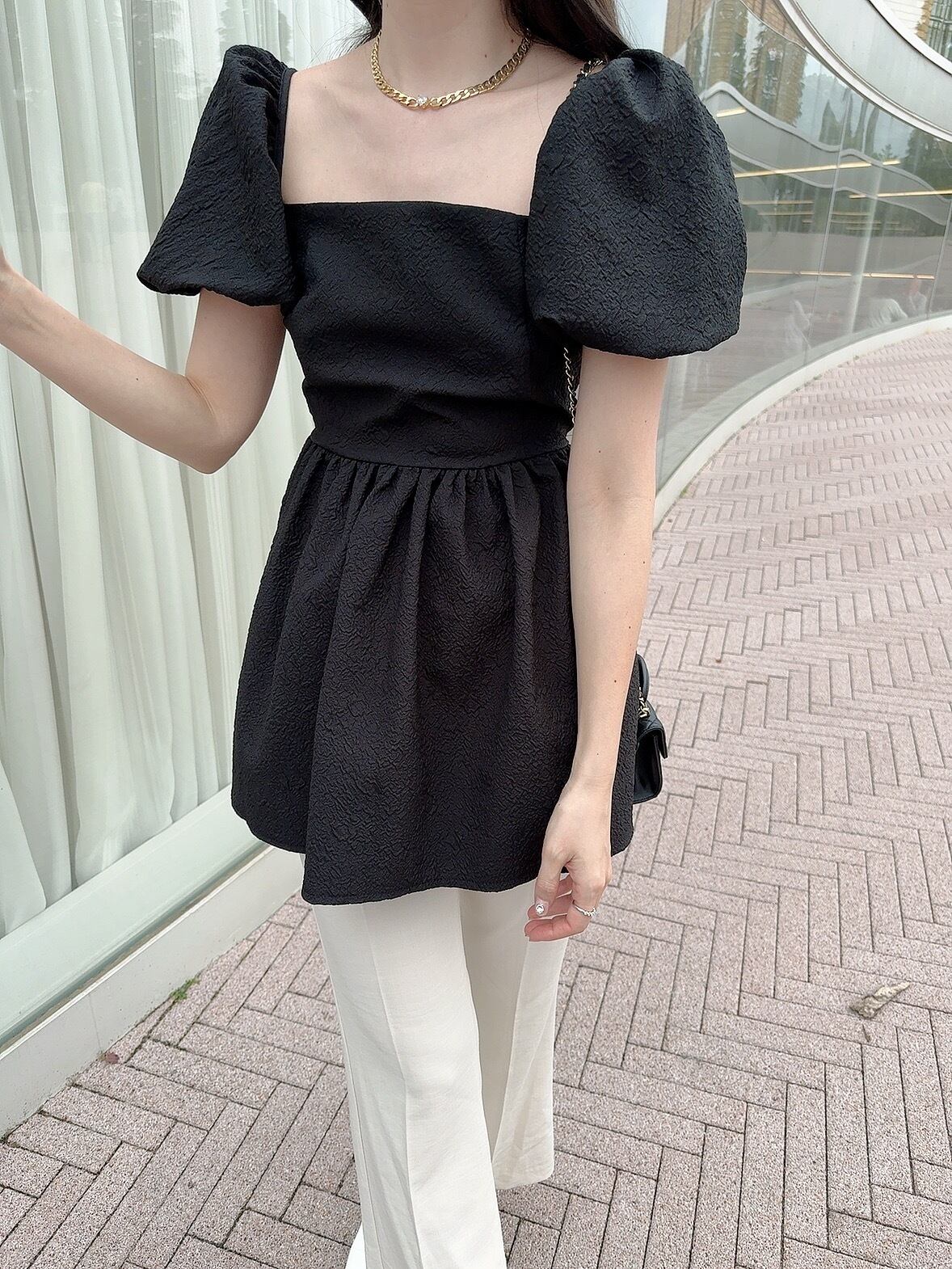 ボリュームが可愛いパフスリーブと、程よい肌見せで抜け感をプラスしたバックリボンスタイルで、360度可愛いおすすめのチュニックブラウス。