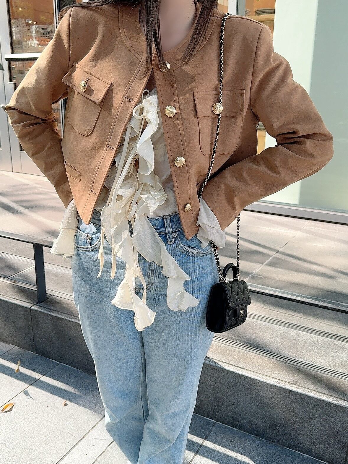 ヴィンテージ感漂うスエード素材が上品でかっこいいノーカラージャケット。ゴールドボタンがアクセントとなり、さりげなくエレガントな印象を与えます。秋の装いにマッチするスエードジャケットは、どんなスタイルにも馴染み、コーディネートの幅を広げてくれる一着です。