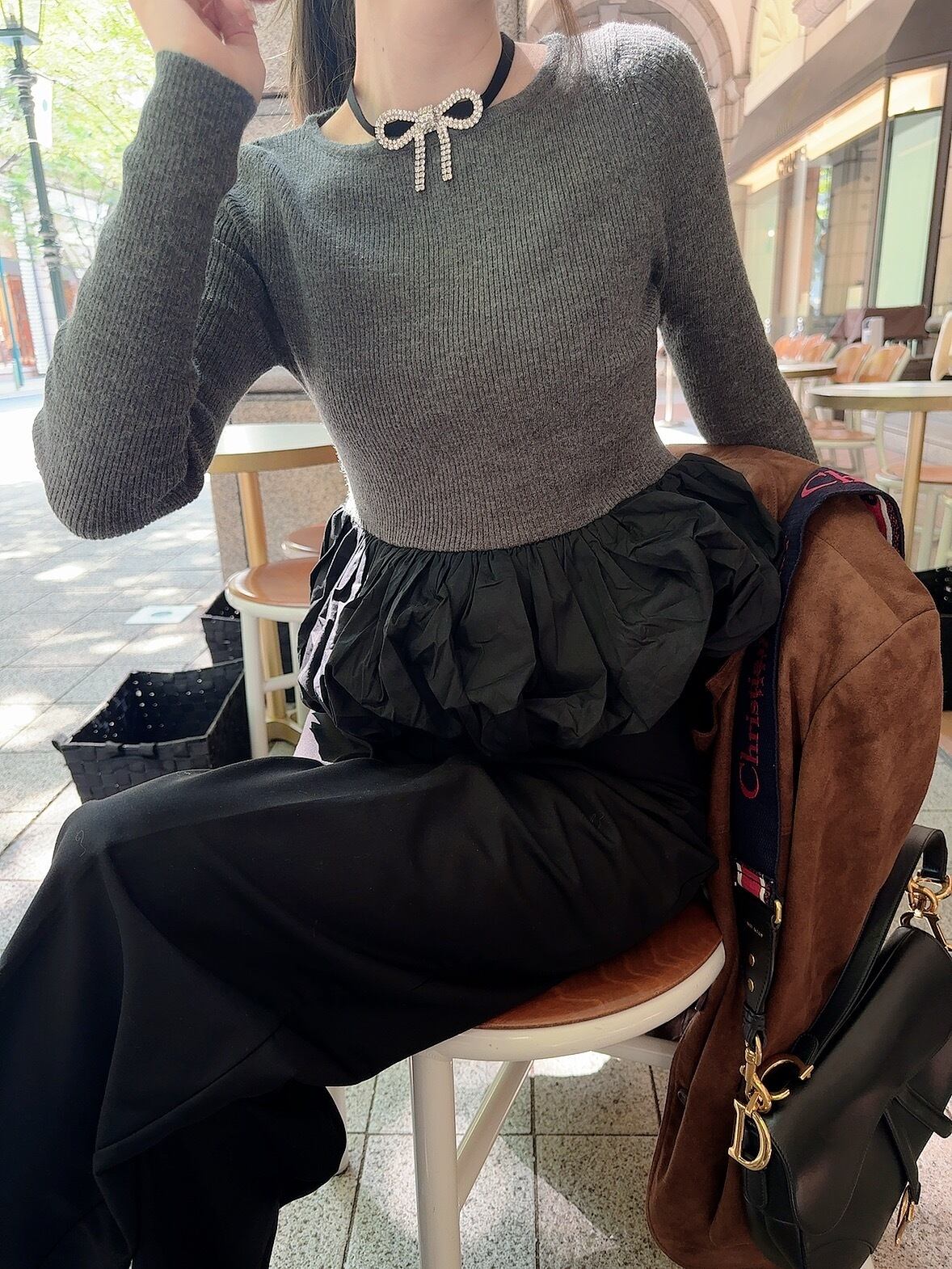 リブ編みのシンプルなラウンドネックニットとたっぷりと生地を使ったボリューミーなバルーン裾のドッキングニット。
