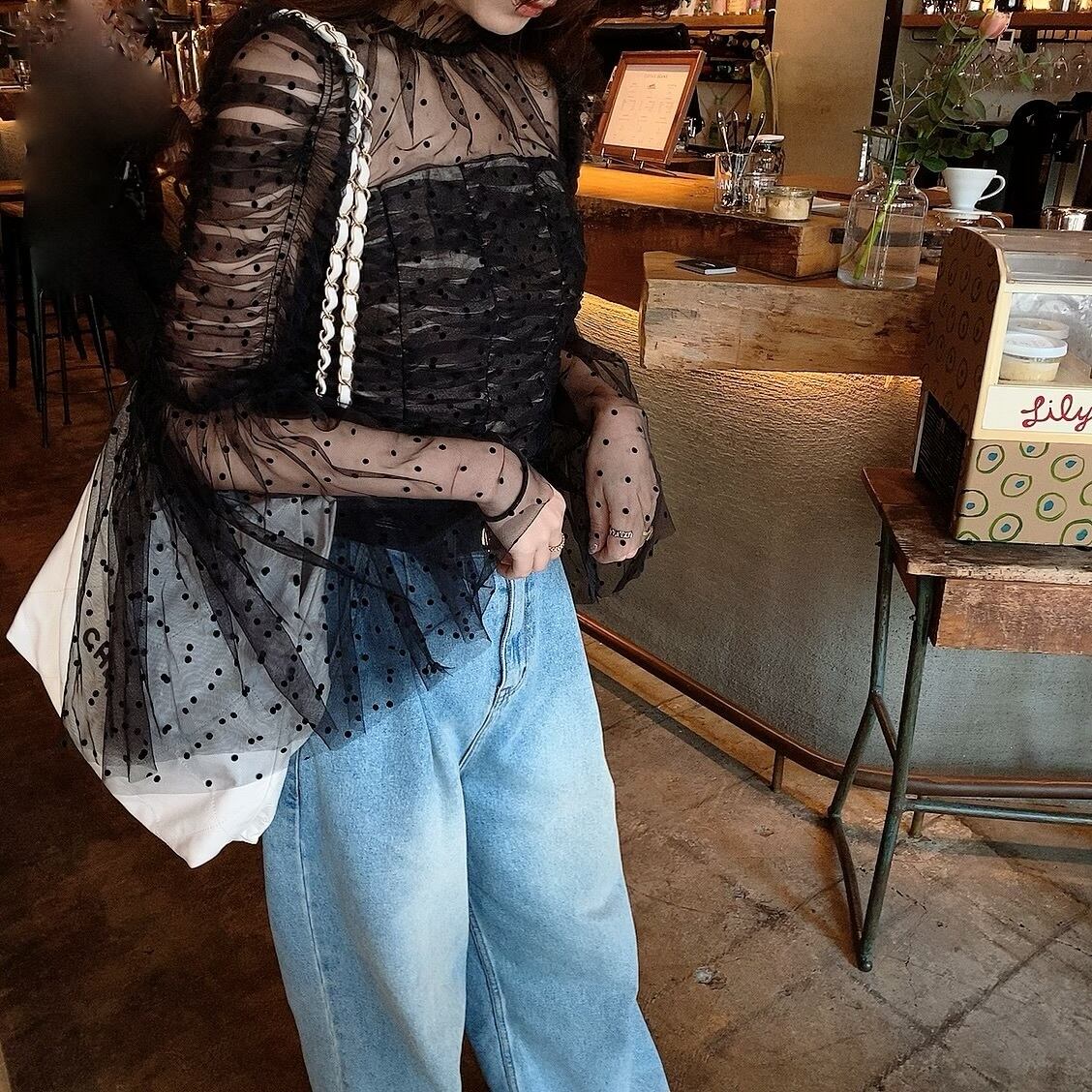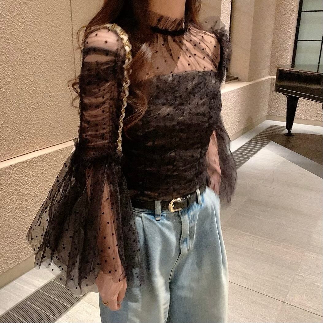 チュール素材の透け感が魅力的な美しいブラウス。メリハリのあるシルエットで目を引く印象に。腕周りは細かいたっぷりギャザーから肘下からフレアに広がる袖のデザインでワンランク上の一枚に。またドットチュールがフェミニンでなんともキュート。